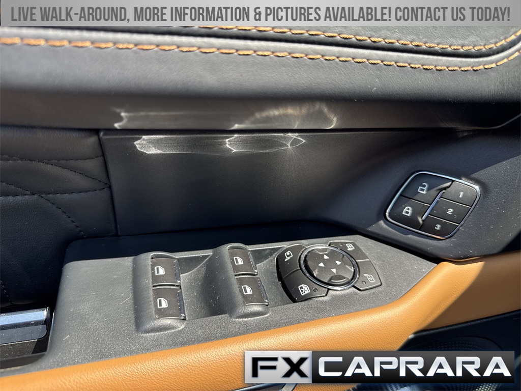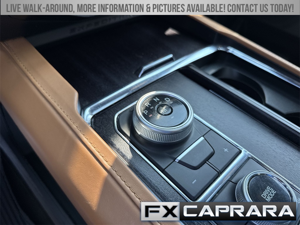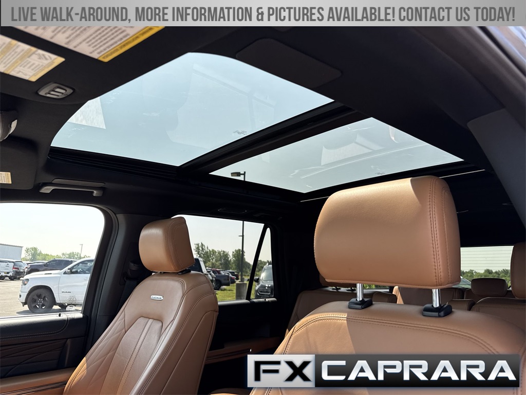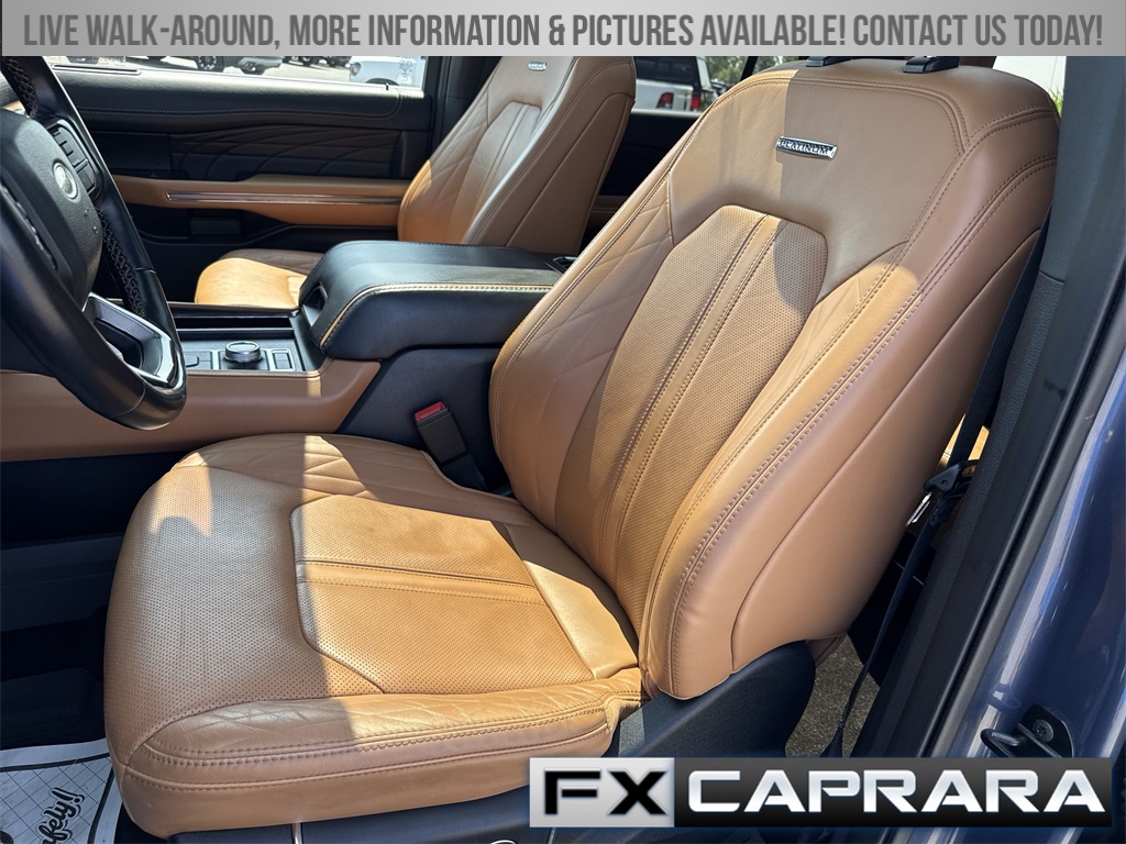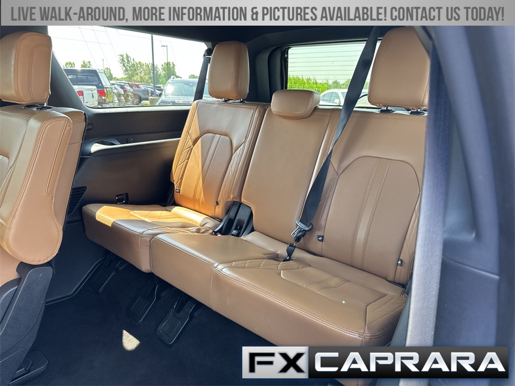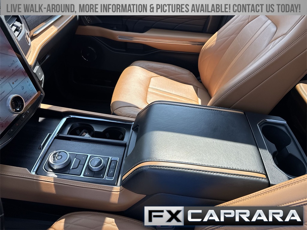 22 Speakers, 3.31 Axle Ratio, 3rd row seats: split-bench, 4-Wheel Disc Brakes, ABS brakes, Adaptive suspension, Adjustable pedals, Air Conditioning, Alloy wheels, AM/FM radio: SiriusXM with 360L, Auto High-beam Headlights, Auto-dimming door mirrors, Auto-dimming Rear-View mirror, Automatic temperature control, Brake assist, Bumpers: body-color, Compass, Delay-off headlights, Driver door bin, Driver vanity mirror, Dual front impact airbags, Dual front side impact airbags, Electronic Stability Control, Emergency communication system: SYNC 4 911 Assist, Exterior Parking Camera Rear, Four wheel independent suspension, Front anti-roll bar, Front Bucket Seats, Front Center Armrest, Front dual zone A/C, Front fog lights, Front reading lights, Fully automatic headlights, Garage door transmitter, Genuine wood console insert, Genuine wood dashboard insert, Genuine wood door panel insert, Heated door mirrors, Heated front seats, Heated rear seats, Heated steering wheel, Heated/Ventilated Leather Front Captain's Chairs, Illuminated entry, Leather steering wheel, Low tire pressure warning, Memory seat, Navigation system: Connected Navigation, Occupant sensing airbag, Outside temperature display, Overhead airbag, Overhead console, Panic alarm, Passenger door bin, Passenger vanity mirror, Pedal memory, Power door mirrors, Power driver seat, Power Liftgate, Power moonroof, Power passenger seat, Power steering, Power windows, Radio data system, Radio: B&O Unleashed Sound System by Bang & Olufsen, Rain sensing wipers, Rear air conditioning, Rear anti-roll bar, Rear audio controls, Rear reading lights, Rear window defroster, Rear window wiper, Reclining 3rd row seat, Remote keyless entry, Security system, SiriusXM w/360L, Speed control, Speed-sensing steering, Speed-Sensitive Wipers, Split folding rear seat, Spoiler, Steering wheel memory, Steering wheel mounted audio controls, SYNC 4 w/Enhanced Voice Recognition, Tachometer, Telescoping steering wheel, Tilt steering wheel, Traction control, Trip computer, Turn signal indicator mirrors, Variably intermittent wipers, Ventilated front seats, Voltmeter, Wheels: 22" 12-Spoke Polished Aluminum.
