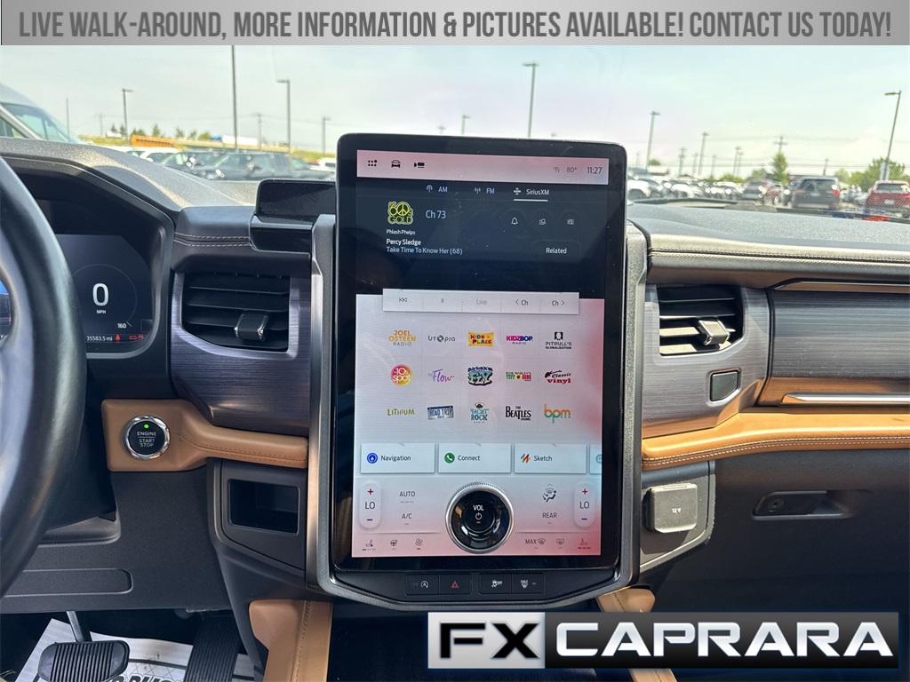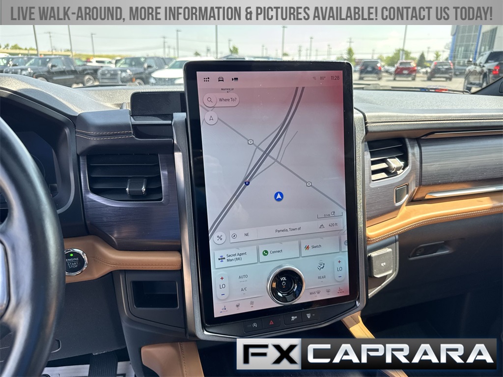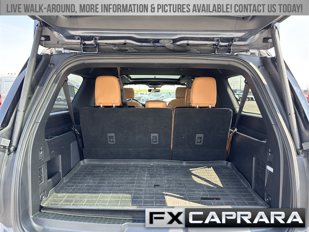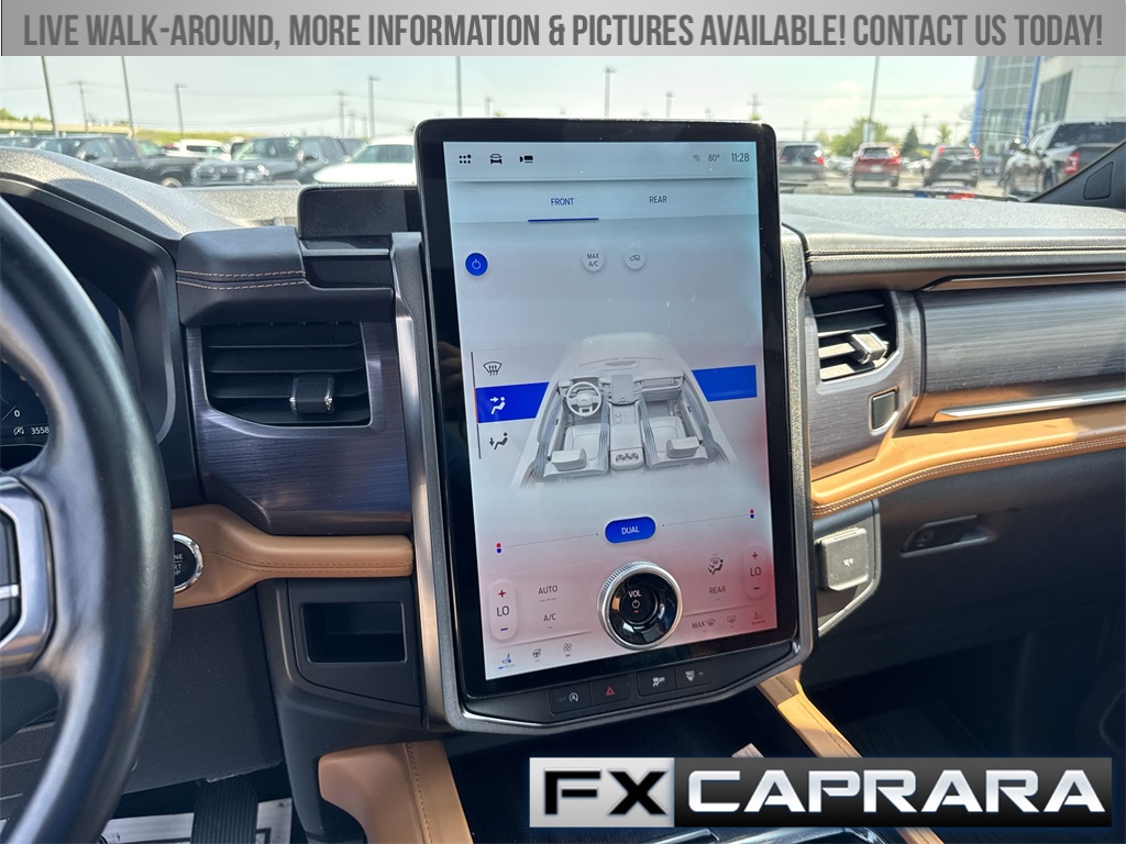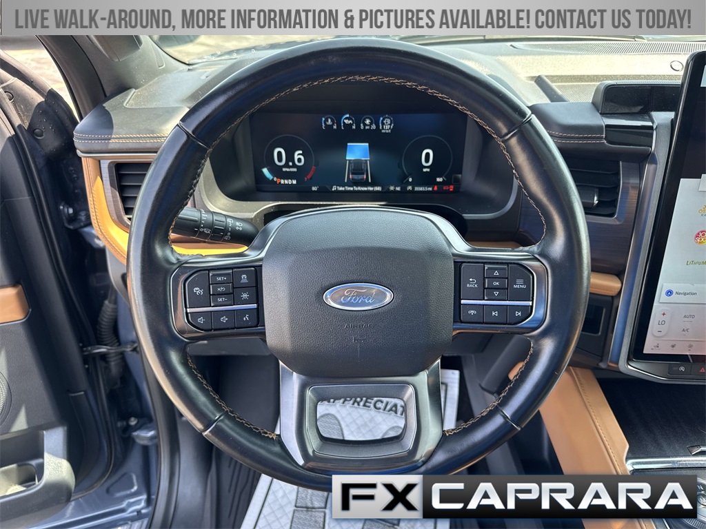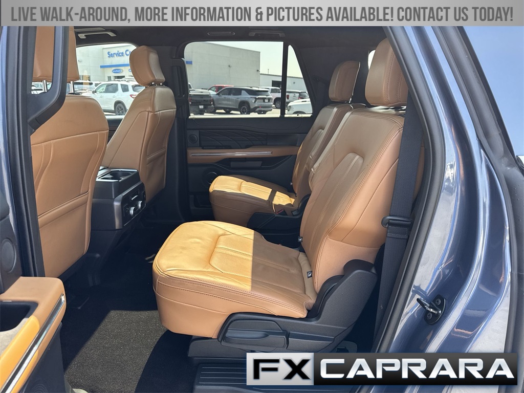 22 Speakers, 3.31 Axle Ratio, 3rd row seats: split-bench, 4-Wheel Disc Brakes, ABS brakes, Adaptive suspension, Adjustable pedals, Air Conditioning, Alloy wheels, AM/FM radio: SiriusXM with 360L, Auto High-beam Headlights, Auto-dimming door mirrors, Auto-dimming Rear-View mirror, Automatic temperature control, Brake assist, Bumpers: body-color, Compass, Delay-off headlights, Driver door bin, Driver vanity mirror, Dual front impact airbags, Dual front side impact airbags, Electronic Stability Control, Emergency communication system: SYNC 4 911 Assist, Exterior Parking Camera Rear, Four wheel independent suspension, Front anti-roll bar, Front Bucket Seats, Front Center Armrest, Front dual zone A/C, Front fog lights, Front reading lights, Fully automatic headlights, Garage door transmitter, Genuine wood console insert, Genuine wood dashboard insert, Genuine wood door panel insert, Heated door mirrors, Heated front seats, Heated rear seats, Heated steering wheel, Heated/Ventilated Leather Front Captain's Chairs, Illuminated entry, Leather steering wheel, Low tire pressure warning, Memory seat, Navigation system: Connected Navigation, Occupant sensing airbag, Outside temperature display, Overhead airbag, Overhead console, Panic alarm, Passenger door bin, Passenger vanity mirror, Pedal memory, Power door mirrors, Power driver seat, Power Liftgate, Power moonroof, Power passenger seat, Power steering, Power windows, Radio data system, Radio: B&O Unleashed Sound System by Bang & Olufsen, Rain sensing wipers, Rear air conditioning, Rear anti-roll bar, Rear audio controls, Rear reading lights, Rear window defroster, Rear window wiper, Reclining 3rd row seat, Remote keyless entry, Security system, SiriusXM w/360L, Speed control, Speed-sensing steering, Speed-Sensitive Wipers, Split folding rear seat, Spoiler, Steering wheel memory, Steering wheel mounted audio controls, SYNC 4 w/Enhanced Voice Recognition, Tachometer, Telescoping steering wheel, Tilt steering wheel, Traction control, Trip computer, Turn signal indicator mirrors, Variably intermittent wipers, Ventilated front seats, Voltmeter, Wheels: 22" 12-Spoke Polished Aluminum.
