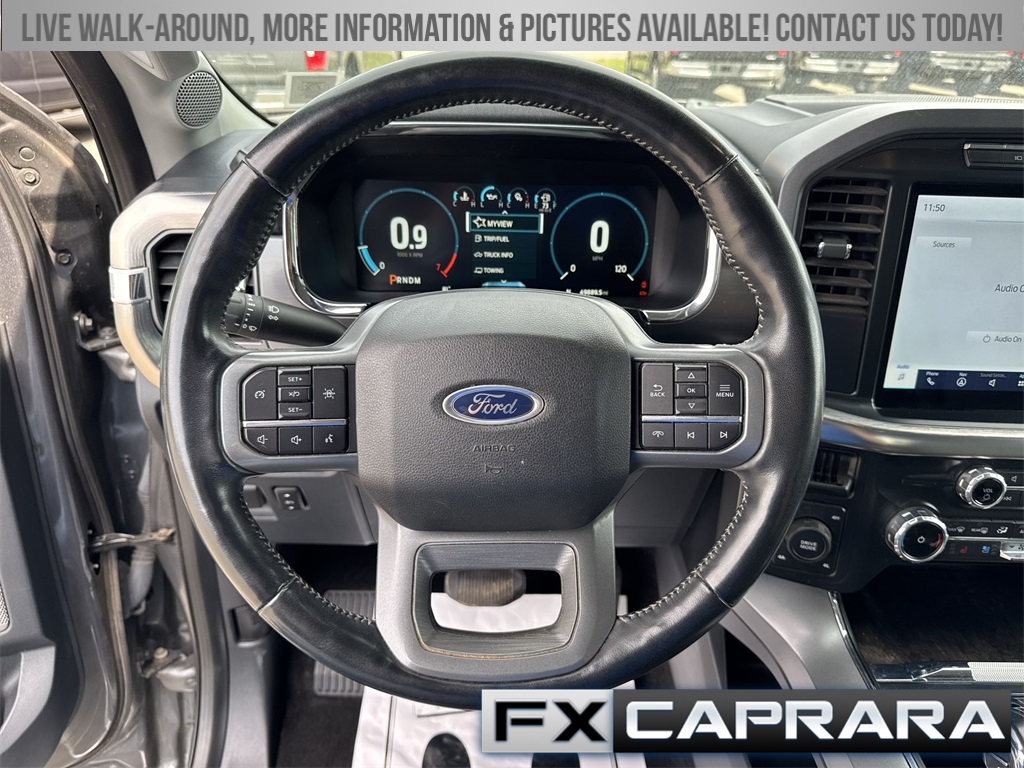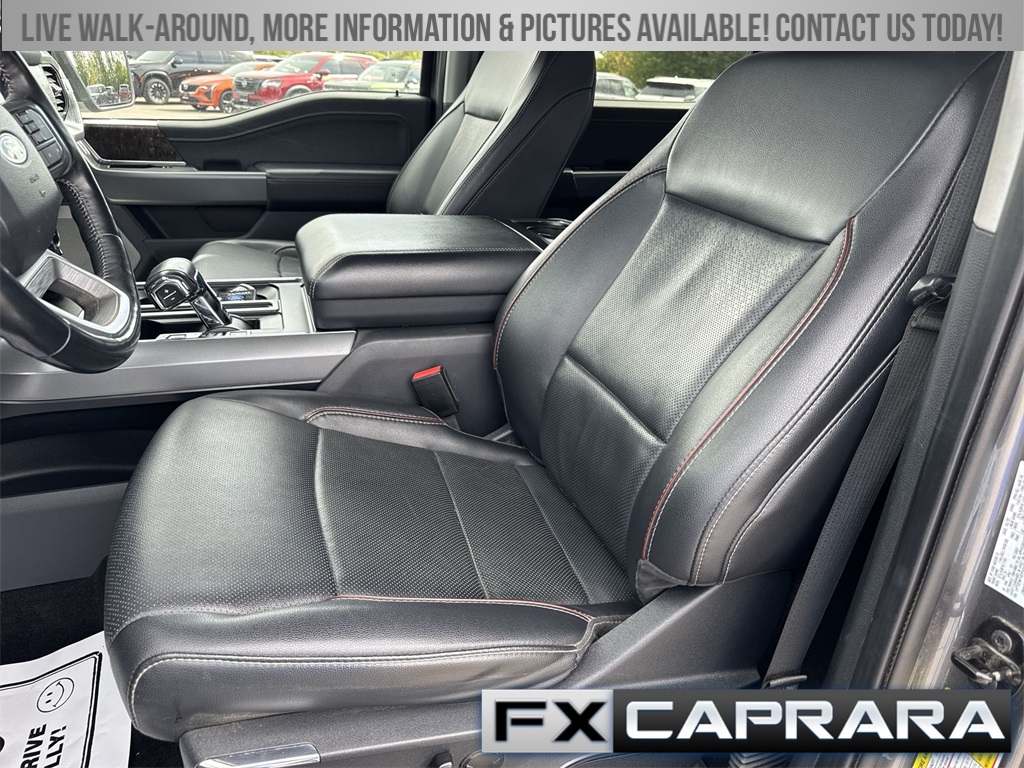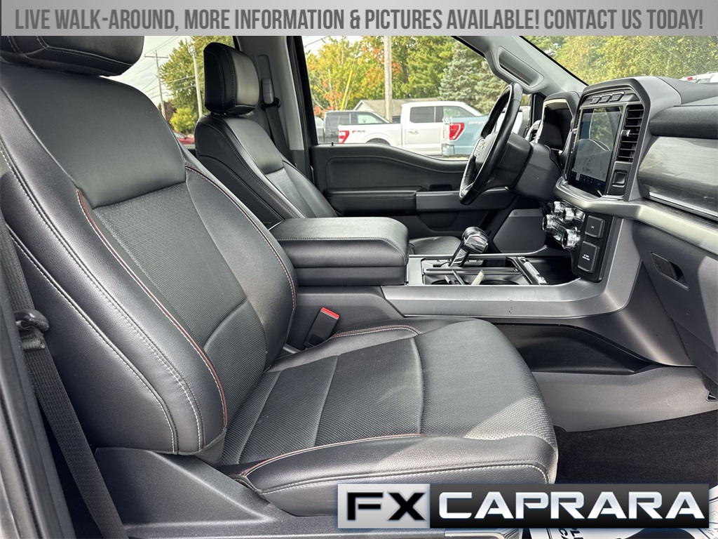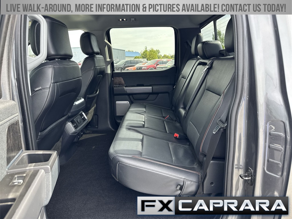 F-150 Lariat, 4D SuperCrew, 10-Speed Automatic, 4WD, Carbonized Gray Metallic, Black Leather, Navigation system: Connected Navigation, 18" Machined-Aluminum Wheels, 3.55 Axle Ratio, 4-Wheel Disc Brakes, 6" Bright Polished Running Board, 7 Speakers, ABS brakes, Adjustable pedals, Air Conditioning, Alloy wheels, AM/FM radio: SiriusXM with 360L, Auto High-beam Headlights, Auto Start-Stop Removal, Auto-dimming door mirrors, Auto-dimming Rear-View mirror, Automatic temperature control, Bed Utility Package, BoxLink, Brake assist, Bumpers: chrome, Chrome 2-Bar Grille w/4 Minor Bars, Chrome Door & Tailgate Handles w/Body-Color Bezel, Chrome Single-Tip Exhaust, Chrome Skull Caps on Exterior Mirrors, Class IV Trailer Hitch Receiver, Compass, Delay-off headlights, Driver door bin, Driver vanity mirror, Dual front impact airbags, Dual front side impact airbags, Electronic Stability Control, Emergency communication system: SYNC 4 911 Assist, Equipment Group 501A Mid, Exterior Parking Camera Rear, Front anti-roll bar, Front Center Armrest w/Storage, Front dual zone A/C, Front fog lights, Front reading lights, Front wheel independent suspension, Fully automatic headlights, GVWR: 6,600 lbs Payload Package, Heated door mirrors, Heated front seats, Illuminated entry, Lariat Chrome Appearance Package, Leather-Trimmed 40/20/40 Front Seat, LED Box Lighting, LED Sideview Mirror Spotlights, Low tire pressure warning, Memory seat, Occupant sensing airbag, Onboard 400W Outlet, Outside temperature display, Overhead airbag, Overhead console, Panic alarm, Passenger door bin, Passenger vanity mirror, Pedal memory, Power door mirrors, Power driver seat, Power passenger seat, Power steering, Power Tailgate, Power windows, Radio data system, Radio: AM/FM SiriusXM w/360L, Radio: B&O Sound System by Bang & Olufsen, Rear reading lights, Rear seat center armrest, Rear step bumper, Rear window defroster, Remote keyless entry, Security system, Speed control, Speed-sensing steering, Split folding rear seat, Steering wheel mounted audio controls, SYNC 4 w/Enhanced Voice Recognition, Tachometer, Tailgate Step w/Tailgate Work Surface, Telescoping steering wheel, Tilt steering wheel, Traction control, Trip computer, Turn signal indicator mirrors, Universal Garage Door Opener, Variably intermittent wipers, Ventilated front seats, Voltmeter, Wheels: 18" Chrome-Like PVD, F-150 Lariat, 4D SuperCrew, 10-Speed Automatic, 4WD, Carbonized Gray Metallic, Black Leather, Navigation system: Connected Navigation.