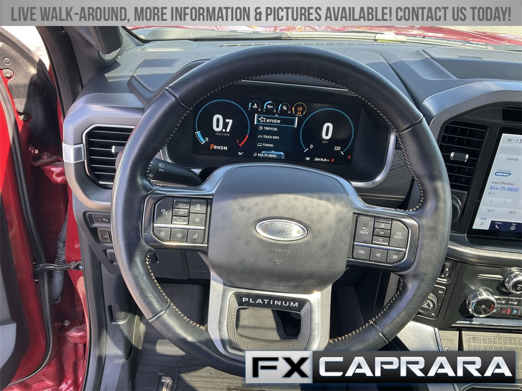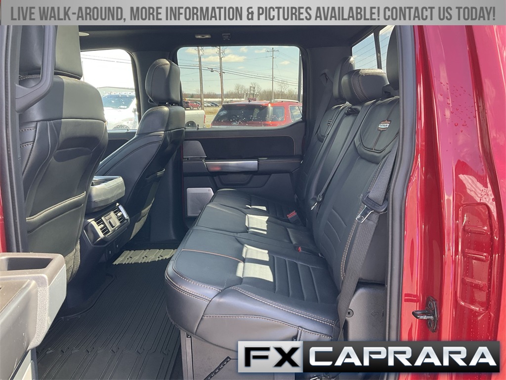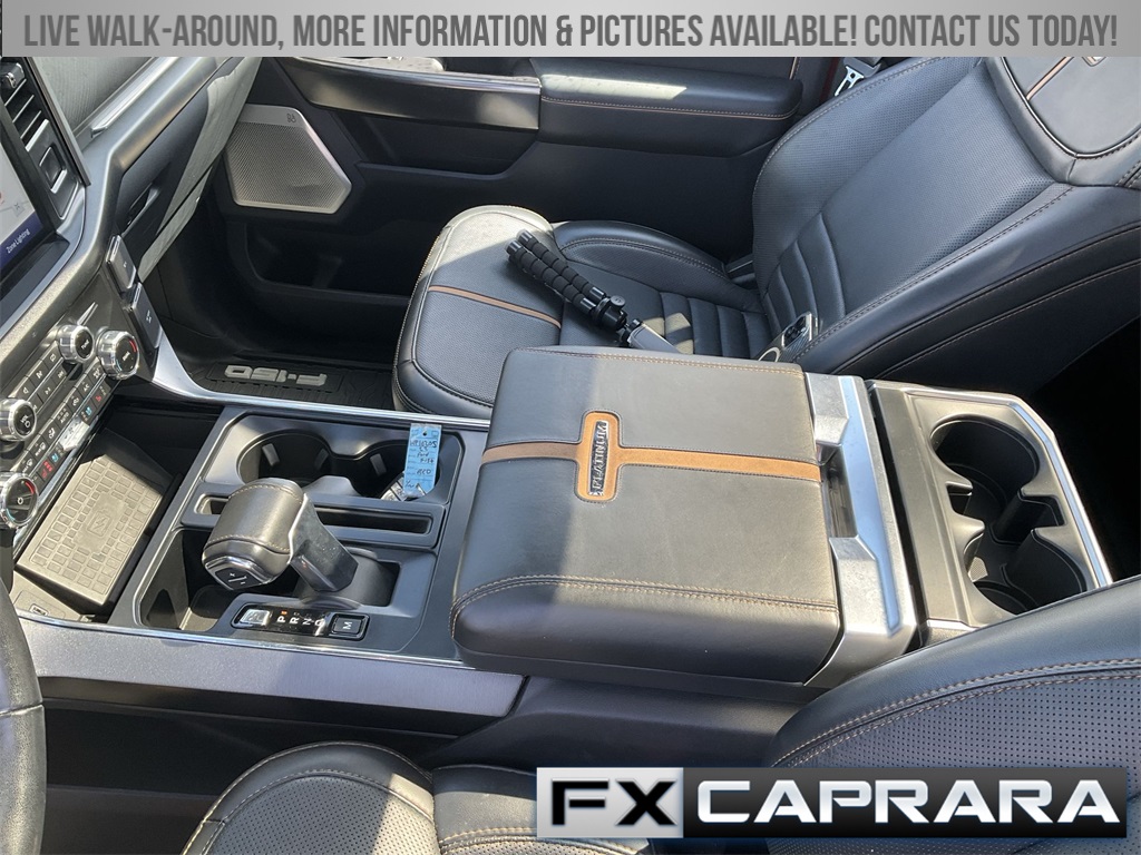 4WD, 20" Polished Aluminum Wheels, 360 Degree Camera, 4-Wheel Disc Brakes, 4x4 FX4 Off-Road Bodyside Decal, 8 Speakers, ABS brakes, Active Park Assist 2.0, Active Park Assist 2.0 Removal, Adjustable pedals, Air Conditioning, Alloy wheels, AM/FM radio: SiriusXM with 360L, Auto High-beam Headlights, Auto Start-Stop Removal, Auto tilt-away steering wheel, Auto-dimming door mirrors, Auto-dimming Rear-View mirror, Automatic temperature control, Bed Utility Package, BlueCruise, BoxLink, Brake assist, Bumpers: body-color, Class IV Trailer Hitch Receiver, Compass, Delay-off headlights, Driver door bin, Driver vanity mirror, Dual front impact airbags, Dual front side impact airbags, Electronic Stability Control, Emergency communication system: SYNC 4 911 Assist, Equipment Group 701A High, Exterior Parking Camera Rear, Ford Co-Pilot360 Active 2.0, Front anti-roll bar, Front Bucket Seats, Front Center Armrest, Front dual zone A/C, Front fog lights, Front reading lights, Front wheel independent suspension, Fully automatic headlights, FX4 Off-Road Package, Garage door transmitter, Heated door mirrors, Heated front seats, Heated rear seats, Heated steering wheel, Hill Descent Control, Illuminated entry, Integrated Trailer Brake Controller, Interior Work Surface, LED Box Lighting, LED Sideview Mirror Spotlights, Low tire pressure warning, Memory seat, Monotube Rear Shocks, Multicontour Seats w/Active Motion Removal, Occupant sensing airbag, Off-Road Tuned Front Shock Absorbers, Outside temperature display, Overhead airbag, Overhead console, Panic alarm, Passenger door bin, Passenger vanity mirror, Pedal memory, Power door mirrors, Power driver seat, Power passenger seat, Power steering, Power Tailgate, Power windows, Pro Power Onboard - 2KW, Pro Trailer Backup Assist, Radio data system, Radio: B&O Sound System by Bang & Olufsen, Radio: B&O Unleashed Sound System by Bang & Olufsen, Rain sensing wipers, Rear reading lights, Rear seat center armrest, Rear step bumper, Rear window defroster, Remote keyless entry, Rock Crawl Mode, Security system, Speed control, Speed-sensing steering, Split folding rear seat, Steering wheel memory, Steering wheel mounted audio controls, SYNC 4 w/Enhanced Voice Recognition, Tachometer, Tailgate Step w/Tailgate Work Surface, Telescoping steering wheel, Tilt steering wheel, Traction control, Trailer Tow Package, Tray Style Floor Liner, Trip computer, Turn signal indicator mirrors, Twin Panel Moonroof, Unique Multi-Contour Leather Bucket Seats, Variably intermittent wipers, Ventilated front seats, Voltmeter, 4WD.