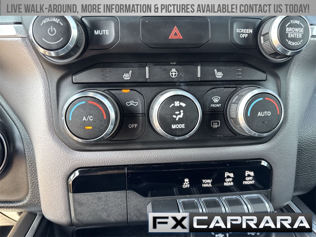 115V Auxiliary Power Outlet, 115V Auxiliary Rear Power Outlet, 2nd Row In Floor Storage Bins, 3 Rear Seat Head Restraints, 3.21 Rear Axle Ratio, 4 Way Front Headrests, 4-Wheel Disc Brakes, 400W Inverter, 48V Belt Starter Generator, 4G LTE Wi-Fi Hot Spot, 6 Speakers, 8.4" Touchscreen Display, ABS brakes, Air Conditioning, Air Conditioning ATC w/Dual Zone Control, Alloy wheels, AM/FM radio, Apple CarPlay, Auto-Dimming Exterior Driver Mirror, Auto-Dimming Rear-View Mirror, Big Horn Badge, Big Horn Level 2 Equipment Group, Black Exterior Mirrors, Black Premium Power Mirrors, Bluetooth Handsfree Phone & Audio, Brake assist, Bumpers: chrome, Class IV Receiver Hitch, Cloth Bench Seat, Cluster 7.0" TFT Color Display, Compass, Connected Services Delete Credit, Connectivity - US/Canada, Convex Wide-Angle Mirror Insert, Delay-off headlights, Driver door bin, Dual front impact airbags, Dual front side impact airbags, Electronic Stability Control, Emergency communication system: SiriusXM Guardian, Exterior Mirrors Courtesy Lamps, Exterior Mirrors w/Heating Element, Exterior Mirrors w/Supplemental Signals, For Details, Visit DriveUconnect.com, Front anti-roll bar, Front Center Armrest w/Storage, Front fog lights, Front reading lights, Front Seat Back Map Pockets, Front wheel independent suspension, Fully automatic headlights, Global Telematics Box Module (TBM), Glove Box Lamp, Google Android Auto, GPS Antenna Input, Heated door mirrors, Heated Front Seats, Heated Steering Wheel, Heavy-Duty Engine Cooling, Illuminated entry, Integrated Center Stack Radio, Integrated Voice Command w/Bluetooth, Leather steering wheel, Low tire pressure warning, Media Hub w/2 Charge Only USBs, Occupant sensing airbag, Outside temperature display, Overhead airbag, Overhead console, Panic alarm, ParkSense Front/Rear Park Assist w/Stop, ParkView Rear Back-Up Camera, Passenger door bin, Passenger vanity mirror, Power 2-Way Driver Lumbar Adjust, Power 8-Way Driver Seat, Power Adjustable Pedals, Power door mirrors, Power steering, Power windows, Power-Folding Mirrors, Quick Order Package 23Z Big Horn, Radio data system, Radio: Uconnect 3 w/5" Display, Radio: Uconnect 5 W w/8.4" Display, Rear 60/40 Folding Seat, Rear anti-roll bar, Rear Dome w/On/Off Switch Lamp, Rear Power Sliding Window, Rear seat center armrest, Rear step bumper, Rear Underseat Compartment Storage (DISC), Rear Wheelhouse Liners, Rear Window Defroster, Remote keyless entry, Remote Start System, Security Alarm, SiriusXM Radio Service, SiriusXM Satellite Radio, Speed control, Split folding rear seat, Steering wheel mounted audio controls, Sun Visors w/Illuminated Vanity Mirrors, Tachometer, Telescoping steering wheel, Tilt steering wheel, Traction control, Trip computer, Universal Garage Door Opener, USB Host Flip, Variably intermittent wipers, Voltmeter, Wheels: 18" x 8" Cast-Aluminum Painted, Wheels: 20" x 9" Aluminum Chrome Clad (WRK).