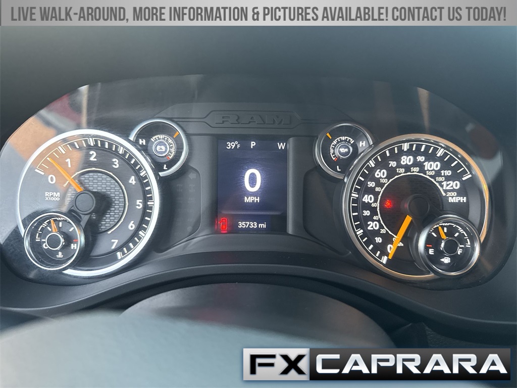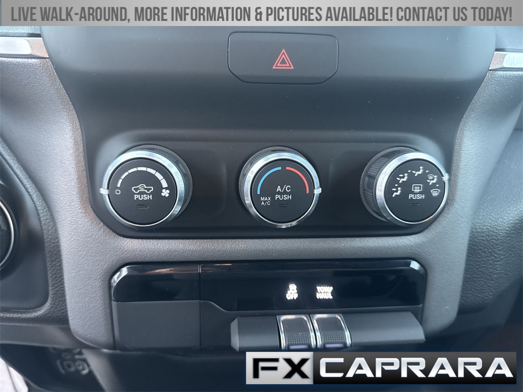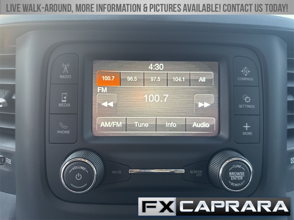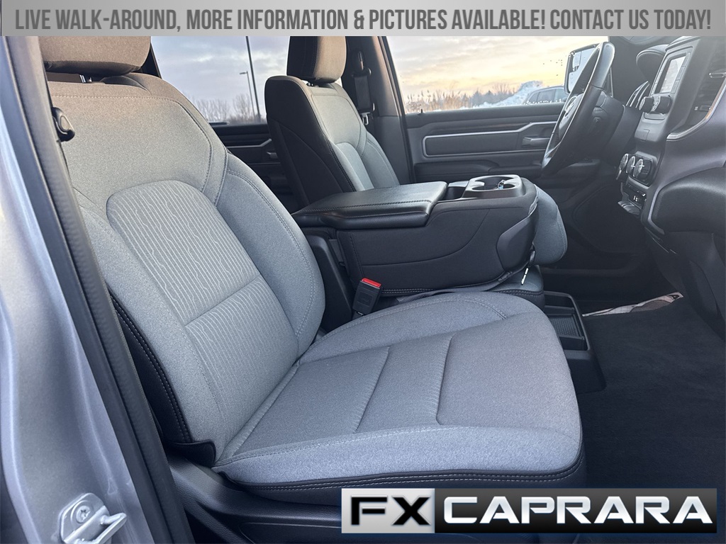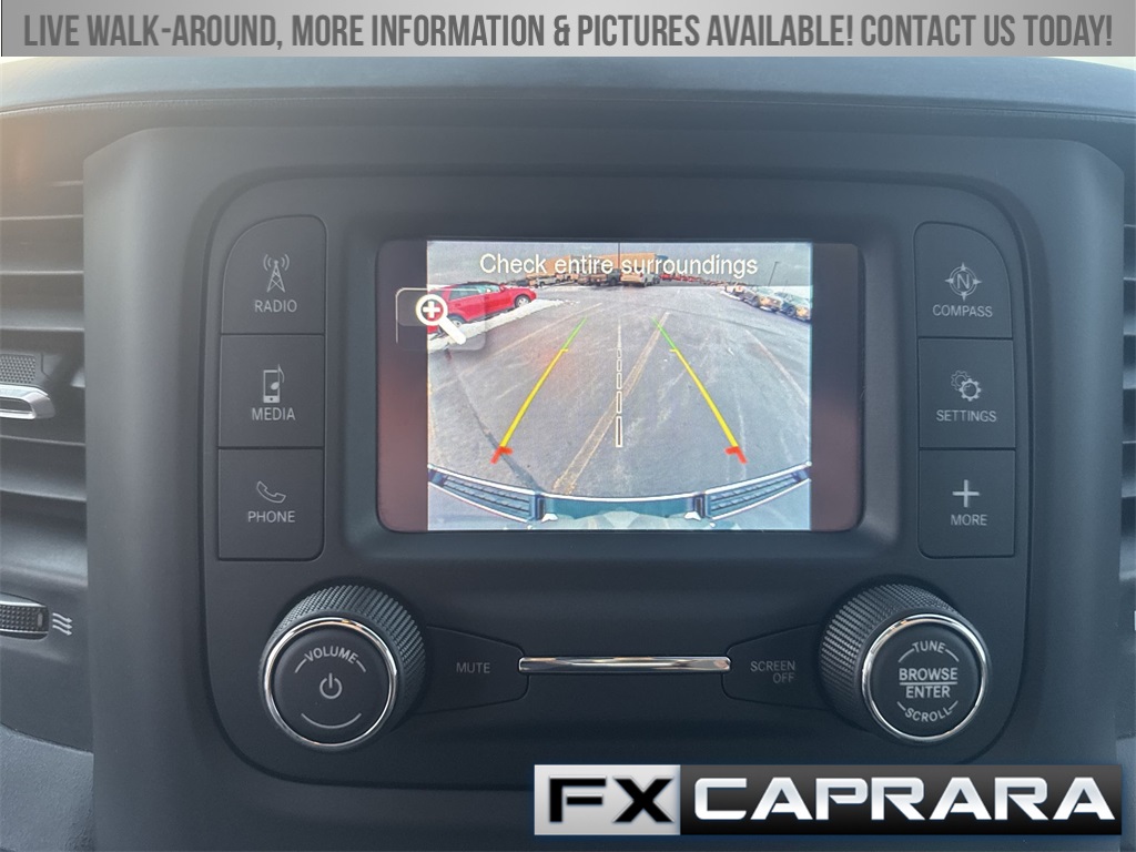 3 Rear Seat Head Restraints, 3.21 Rear Axle Ratio, 4 Way Front Headrests, 4-Wheel Disc Brakes, 48V Belt Starter Generator, 6 Speakers, ABS brakes, Air Conditioning, Alloy wheels, AM/FM radio, Big Horn Badge, Black Exterior Mirrors, Brake assist, Bumpers: chrome, Cloth Bench Seat, Compass, Convex Wide-Angle Mirror Insert, Delay-off headlights, Driver door bin, Dual front impact airbags, Dual front side impact airbags, Electronic Stability Control, Emergency communication system: SiriusXM Guardian, Front anti-roll bar, Front Center Armrest w/Storage, Front fog lights, Front License Plate Bracket, Front reading lights, Front Seat Back Map Pockets, Front wheel independent suspension, Fully automatic headlights, Global Telematics Box Module (TBM), GPS Antenna Input, Heated door mirrors, Heavy-Duty Engine Cooling, Illuminated entry, Integrated Voice Command w/Bluetooth, Leather steering wheel, Low tire pressure warning, MOPAR Front & Rear Rubber Floor Mats, Occupant sensing airbag, Outside temperature display, Overhead airbag, Overhead console, Panic alarm, ParkView Rear Back-Up Camera, Passenger door bin, Passenger vanity mirror, Power door mirrors, Power steering, Power windows, Quick Order Package 23Z Big Horn, Radio data system, Radio: Uconnect 3 w/5" Display, Rear 60/40 Folding Seat, Rear anti-roll bar, Rear seat center armrest, Rear step bumper, Remote keyless entry, Speed control, Split folding rear seat, Steering wheel mounted audio controls, Tachometer, Telescoping steering wheel, Tilt steering wheel, Traction control, Trip computer, Variably intermittent wipers, Voltmeter, Wheels: 18" x 8" Cast-Aluminum Painted, Wheels: 20" x 9" Aluminum Chrome Clad (WRK).