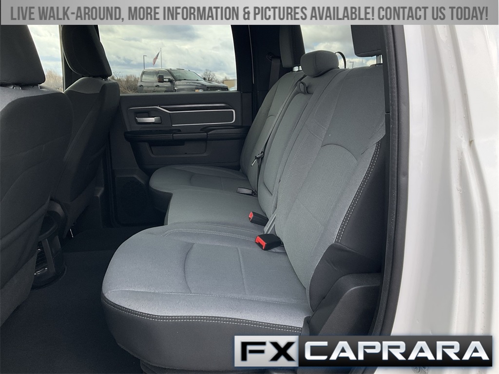 2 Way Rear Headrest Seat, 3.73 Axle Ratio, 4 Way Front Headrests, 4-Wheel Disc Brakes, 40/20/40 Split Bench Seat, 4G LTE Wi-Fi Hot Spot, 6 Speakers, 6000# Front Axle w/Hub Ext, 8.4" Touchscreen Display, ABS brakes, Active Noise Control System, Air Conditioning, AM/FM radio: SiriusXM, Apple CarPlay, Apple CarPlay/Android Auto, Bluetooth Handsfree Phone & Audio, Box & Rear Fender Clearance Lamps, Brake assist, Bright Wheel Skins, Bumpers: chrome, Center Hub, Center Stack Storage Drawer, Clearance Lamps, Cloth 40/20/40 Bench Seat, Compass, Connectivity - US/Canada, Delay-off headlights, Driver door bin, Dual front impact airbags, Dual front side impact airbags, Dual Rear Wheels, Electronic Stability Control, Electronically Controlled Throttle, For More Info, Call 800-643-2112, Front anti-roll bar, Front Armrest w/Cupholders, Front Center Armrest w/Storage, Front reading lights, Fully automatic headlights, Global Telematics Box Module (TBM), GPS Antenna Input, Heated door mirrors, Illuminated entry, Integrated Voice Command w/Bluetooth, Low tire pressure warning, Manual Adjust 4-Way Driver Seat, Manual Adjust 4-Way Front Passenger Seat, Manufacturer's Statement of Origin, Occupant sensing airbag, Outside temperature display, Overhead airbag, Overhead console, Panic alarm, ParkView Rear Back-Up Camera, Passenger door bin, Passenger vanity mirror, Power door mirrors, Power steering, Power windows, Quick Order Package 2HZ Big Horn, Radio data system, Radio: Uconnect 5 w/8.4" Display, Rear Folding Seat, Rear seat center armrest, Rear step bumper, Rear Wheelhouse Liners, Remote keyless entry, Remote Start System, Selectable Tire Fill Alert, SiriusXM Radio Service, SiriusXM Satellite Radio, Speed control, Storage Tray, Tachometer, Tilt steering wheel, Tip Start, Traction control, Trip computer, Turn signal indicator mirrors, Variably intermittent wipers, Voltmeter, Wheels: 17" x 6.0" Steel Chrome Clad, Wheels: 18" x 8.0" Steel Chrome Clad.