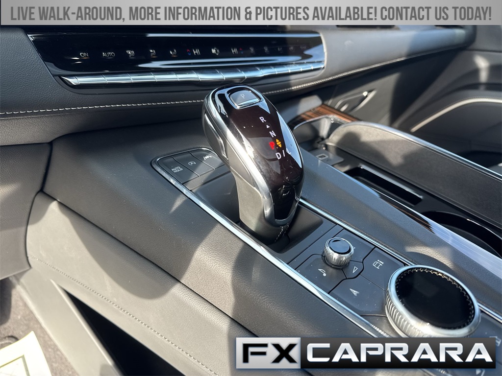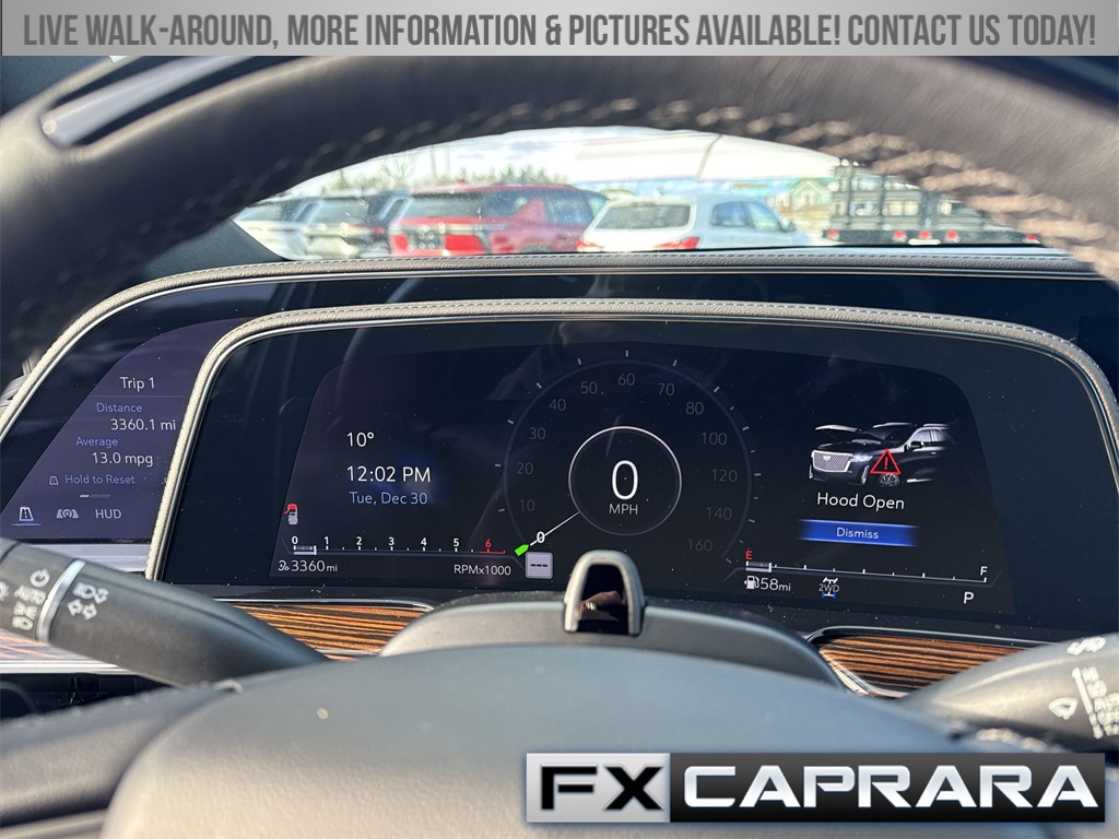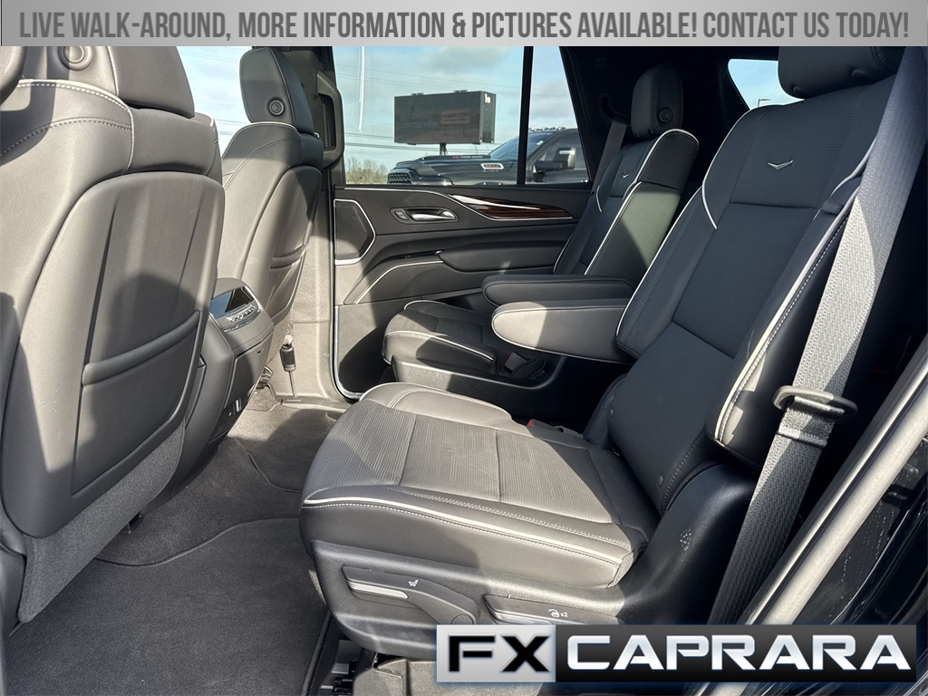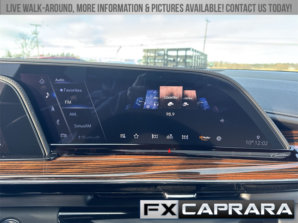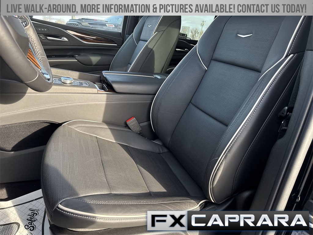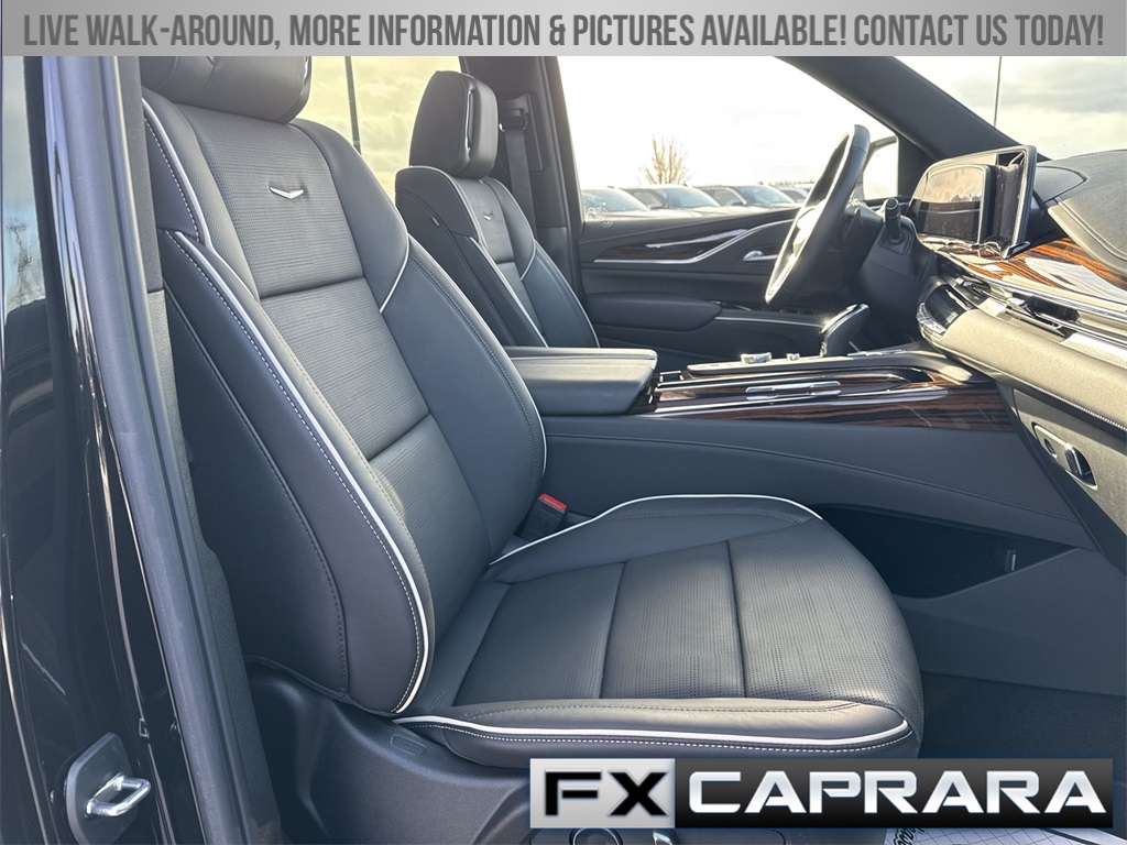 AWD, Leather, 16.9" Diagonal OLED Infotainment Screen, 19 Speakers, 2-Presets Memory For Driver Seat Adjuster, 3.23 Axle Ratio, 3rd row seats: split-bench, 4-Way Power Driver Lumbar Seat Adjuster, 4-Way Power Front Passenger Lumbar Seat Adjuster, 4-Wheel Disc Brakes, 8-Way Power Driver Seat Adjuster, 8-Way Power Front Passenger Seat Adjuster, ABS brakes, Adaptive Cruise Control, Air Conditioning, AKG Studio 19-Speaker Audio System, Alloy wheels, AM/FM radio: SiriusXM with 360L, Apple CarPlay/Android Auto, Audio memory, Auto High-beam Headlights, Auto tilt-away steering wheel, Auto-dimming door mirrors, Auto-dimming Rear-View mirror, Automatic Seat Belt Tightening, Automatic temperature control, Brake assist, Bumpers: body-color, Compass, Delay-off headlights, Door Lock & Latch Shields, Driver door bin, Driver vanity mirror, Dual front impact airbags, Dual front side impact airbags, Electronic Stability Control, Emergency communication system: OnStar and Cadillac connected services capable, Enhanced Automatic Emergency Braking, Enhanced Automatic Parking Assist, Exterior Parking Camera Rear, Four wheel independent suspension, Front anti-roll bar, Front Bucket Seats, Front Center Armrest w/Storage, Front dual zone A/C, Front reading lights, Fully automatic headlights, Garage door transmitter, Glass Breakage Sensor, HD Radio, Heads-Up Display, Heated & Ventilated Driver & Front Passenger Seats, Heated door mirrors, Heated Driver & Front Passenger Seats, Heated front seats, Heated rear seats, Heated steering wheel, Illuminated entry, Lane Change Alert w/Side Blind Zone Alert, Leather Seating Surfaces w/Mini-Chevron Perf Inserts, Low tire pressure warning, Mechanical Limited-Slip Differential, Memory seat, Navigation System, Occupant sensing airbag, Outside temperature display, Overhead airbag, Overhead console, Panic alarm, Passenger door bin, Passenger vanity mirror, Power door mirrors, Power driver seat, Power Liftgate, Power moonroof, Power Panoramic Tilt-Sliding Sunroof, Power passenger seat, Power steering, Power windows, Premium Smooth Ride Suspension, Radio data system, Radio: AM/FM w/Navigation, Rain sensing wipers, Rear air conditioning, Rear anti-roll bar, Rear Camera Mirror, Rear Camera Mirror Washer, Rear Cross Traffic Alert, Rear reading lights, Rear window defroster, Rear window wiper, Reconfigurable Full-Color Head-Up Display, Remote keyless entry, Reverse Automatic Braking, Running Board Assist Steps, Security system, SiriusXM w/360L, Speed control, Split folding rear seat, Spoiler, Steering wheel memory, Steering wheel mounted audio controls, Tachometer, Teen Driver, Telescoping steering wheel, Theft-Deterrent Alarm System, Tilt steering wheel, Traction control, Trip computer, Turn signal indicator mirrors, Variably intermittent wipers, Vehicle Inclination Sensor, Vehicle Interior Movement Sensor, Ventilated front seats, Voltmeter, Wheels: 22" 14-Spoke Alloy w/Polished Finish, Wireless Apple CarPlay/Wireless Android Auto, AWD, Leather.