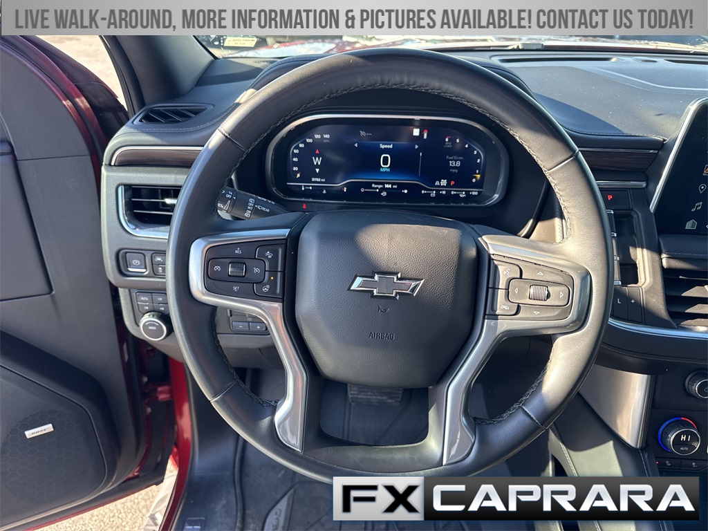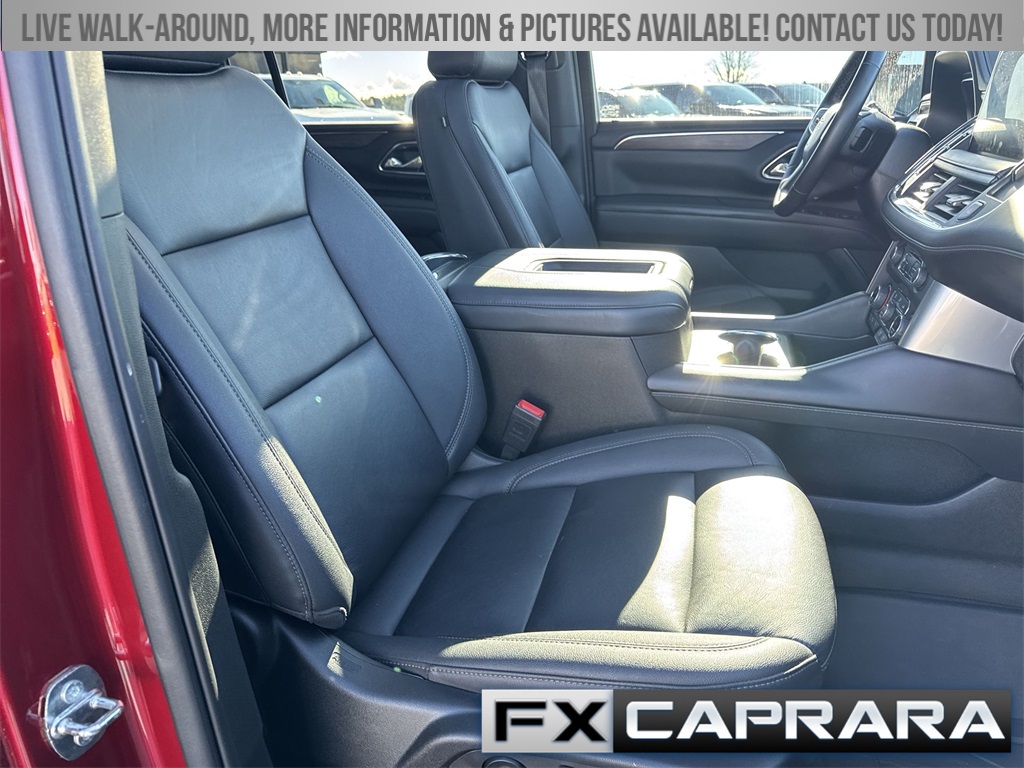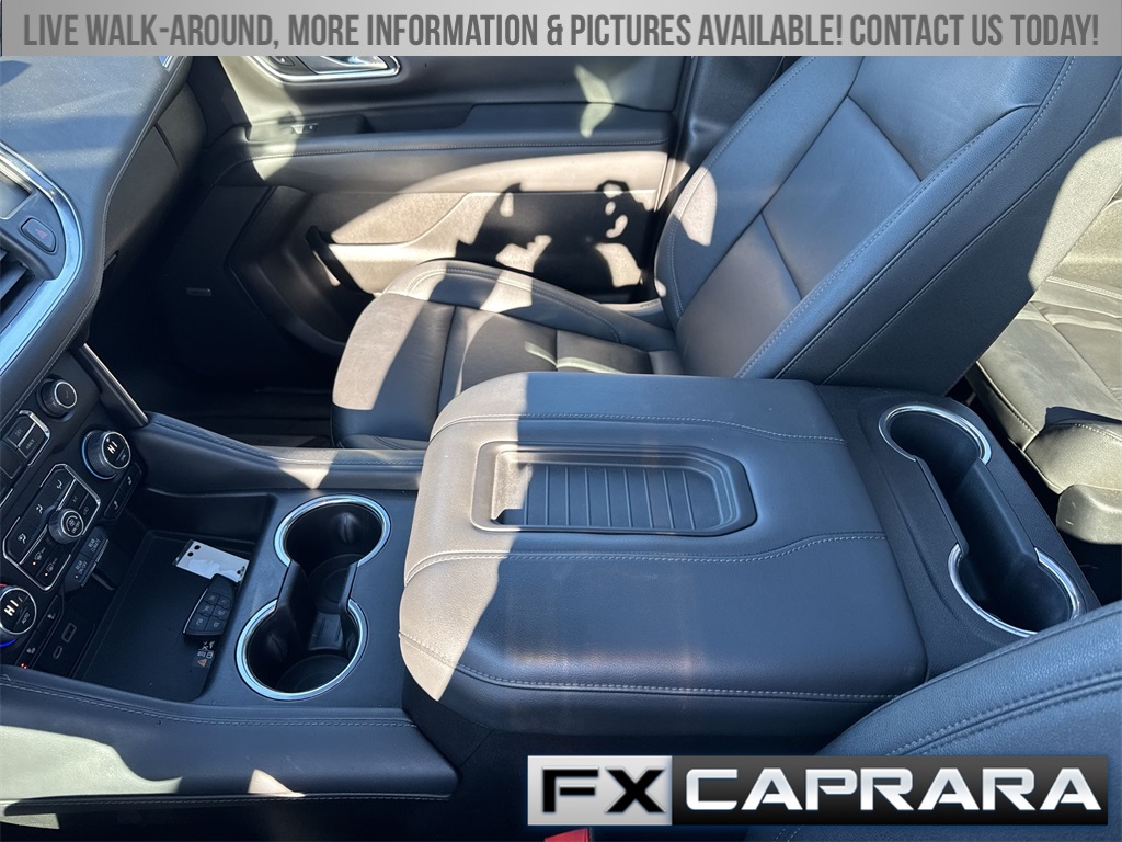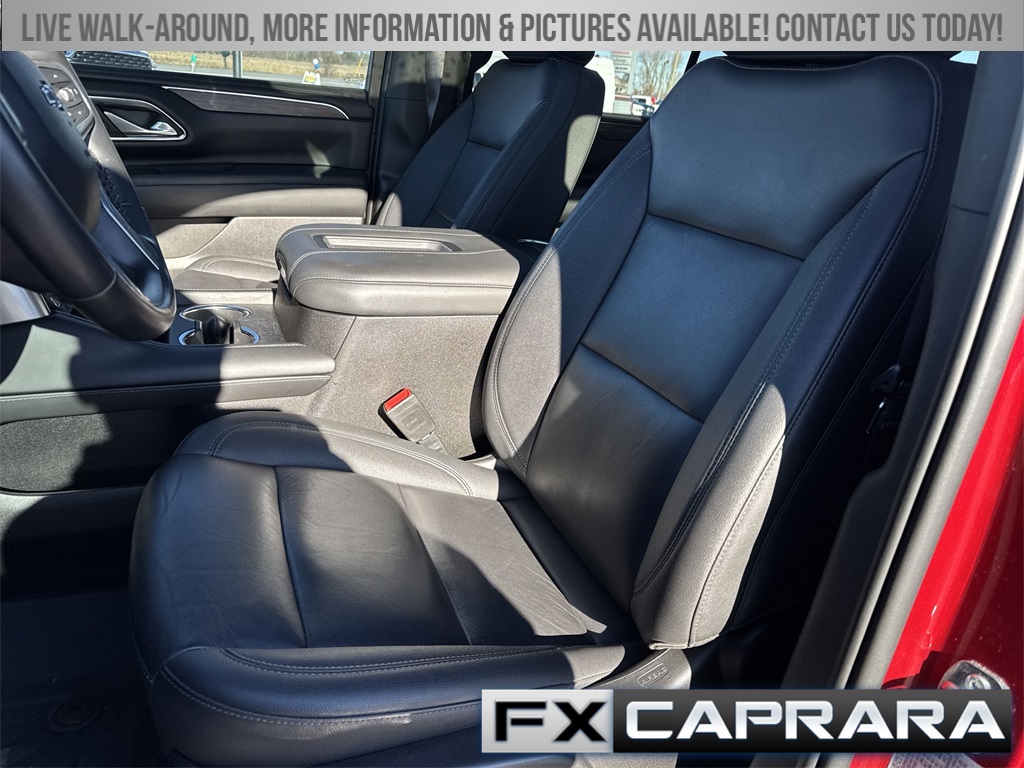 10-Way Power Driver & Passenger Seat Adjusters, 1st & 2nd Row Color-Keyed Carpeted Floor Mats, 2-Speed Active Electronic AutoTrac Transfer Case, 3.23 Rear Axle Ratio, 3rd row seats: split-bench, 4-Wheel Disc Brakes, 9 Speakers, ABS brakes, Air Conditioning, Alloy wheels, AM/FM radio: SiriusXM with 360L, Apple CarPlay/Android Auto, Auto High-beam Headlights, Auto-Dimming Inside Rear-View Mirror, Auto-dimming Rear-View mirror, Automatic temperature control, Black Tubular Assist Steps, Bose 9-Speaker Stereo Audio System Feature, Brake assist, Bright Front & Rear Door Sill Plates, Bumpers: body-color, Color-Keyed Carpeting Floor Covering, Compass, Delay-off headlights, Driver & Front Outboard Passenger Airbags, Driver door bin, Driver vanity mirror, Dual front impact airbags, Dual front side impact airbags, Electronic Stability Control, Emergency communication system: OnStar and Chevrolet connected services capable, Enhanced Driver Information Center, Floor Console w/Storage Area, Four wheel independent suspension, Front anti-roll bar, Front Bucket Seats, Front Center Armrest, Front dual zone A/C, Front High-Approach Angle Fascia, Front reading lights, Fully automatic headlights, Garage door transmitter, Hands-Free Rear Power Programmable Liftgate, Heated door mirrors, Heated Driver & Front Passenger Seats, Heated front seats, Heavy-Duty Air Filter, Hill Descent Control, Illuminated entry, Infotainment Display, Leather-Appointed Seating, LED Daytime Running Lamps, Low tire pressure warning, Memory seat, Memory Settings For Driver, Navigation System, Occupant sensing airbag, Outside temperature display, Overhead airbag, Overhead console, Panic alarm, Passenger door bin, Passenger vanity mirror, Power door mirrors, Power driver seat, Power Liftgate, Power passenger seat, Power steering, Power windows, Premium audio system: Chevrolet Infotainment 3 Premium, Premium Smooth Ride Suspension, Radio: Chevrolet Infotainment 3 Premium System, Rain sensing wipers, Rear air conditioning, Rear anti-roll bar, Rear reading lights, Rear seat center armrest, Rear window defroster, Rear window wiper, Red Recovery Hooks, Remote keyless entry, Remote Start, Roof rack: rails only, Security system, SiriusXM Radio w/360L, Speed control, Speed-sensing steering, Split folding rear seat, Spoiler, Steering wheel mounted audio controls, Tachometer, Telescoping steering wheel, Tilt steering wheel, Traction control, Trip computer, Universal Home Remote, Variably intermittent wipers, Voltmeter, Wheels: 20" x 9" Machined Aluminum, Wireless Charging, Wrapped Steering Wheel.