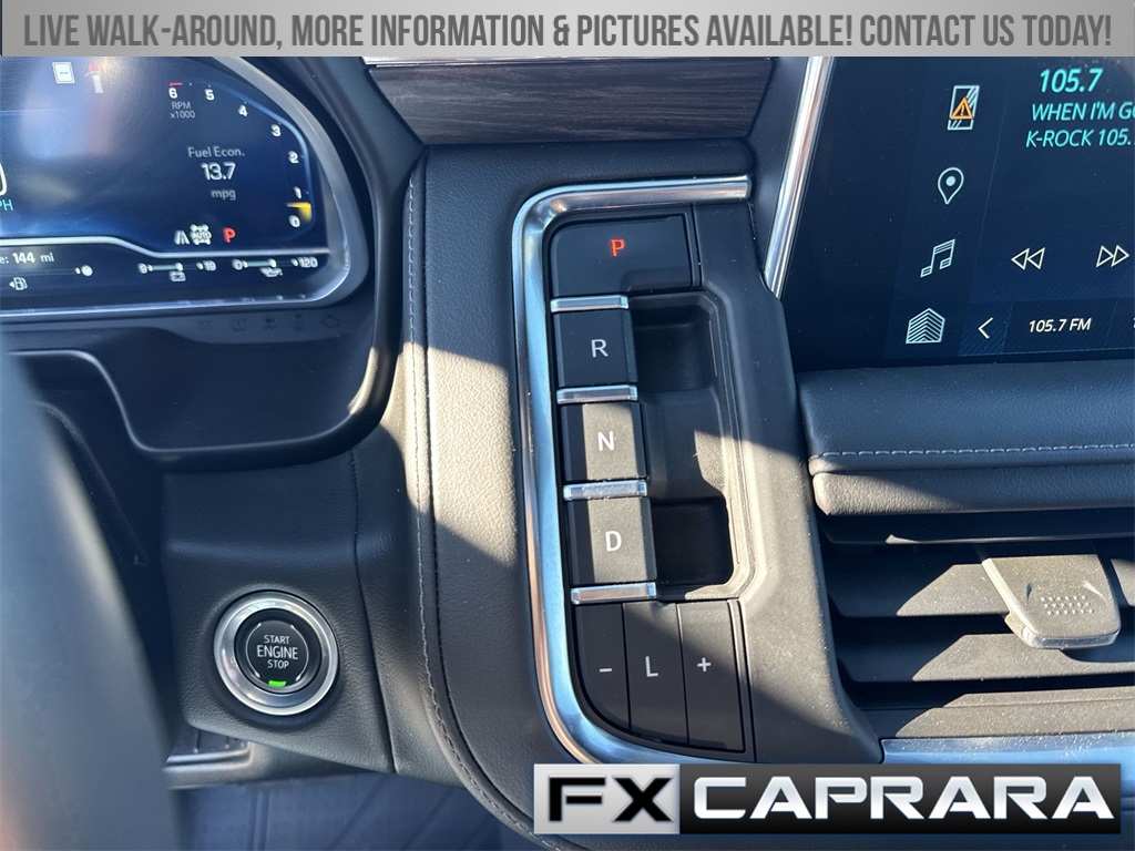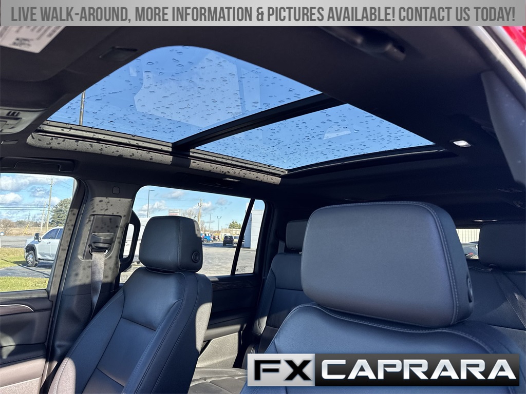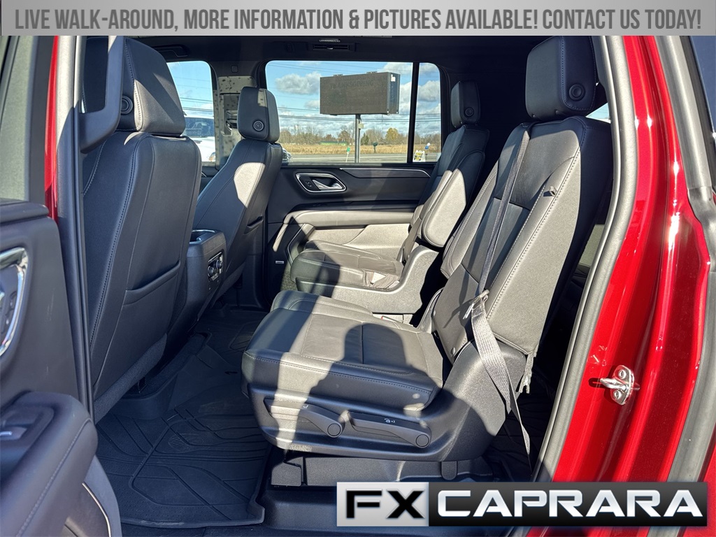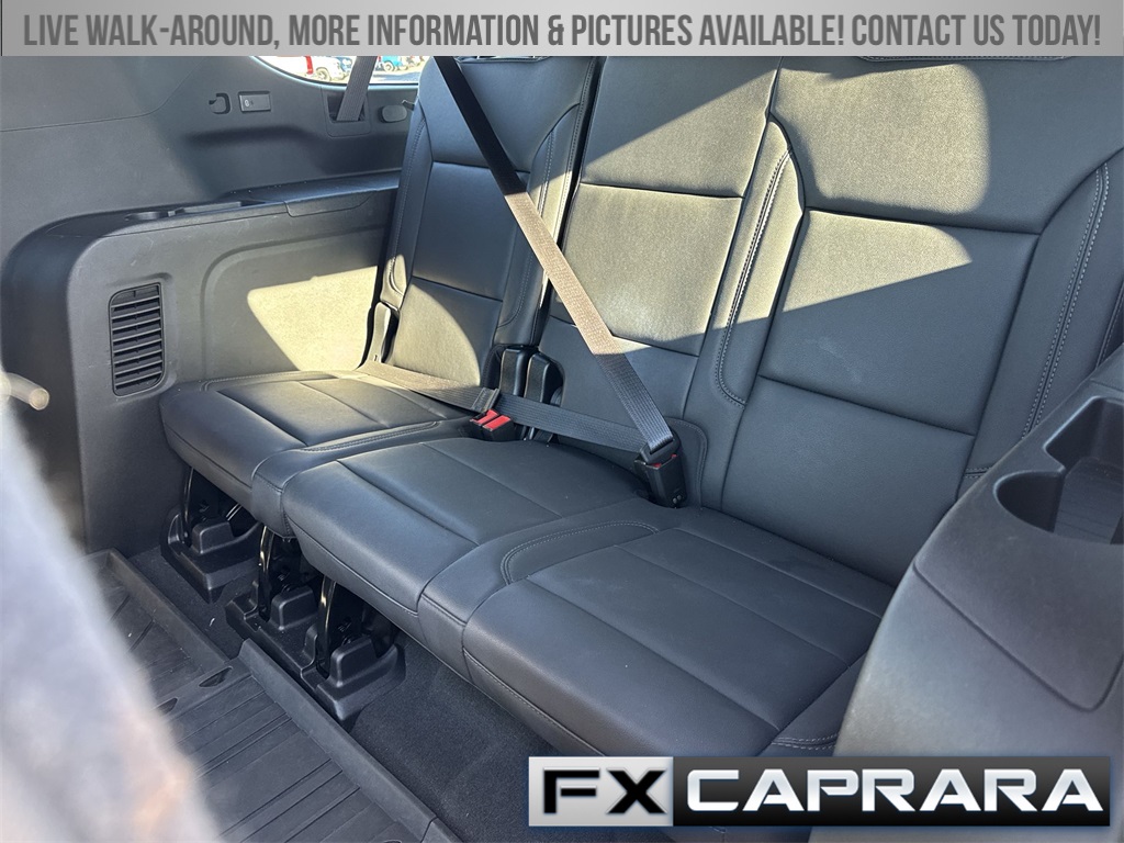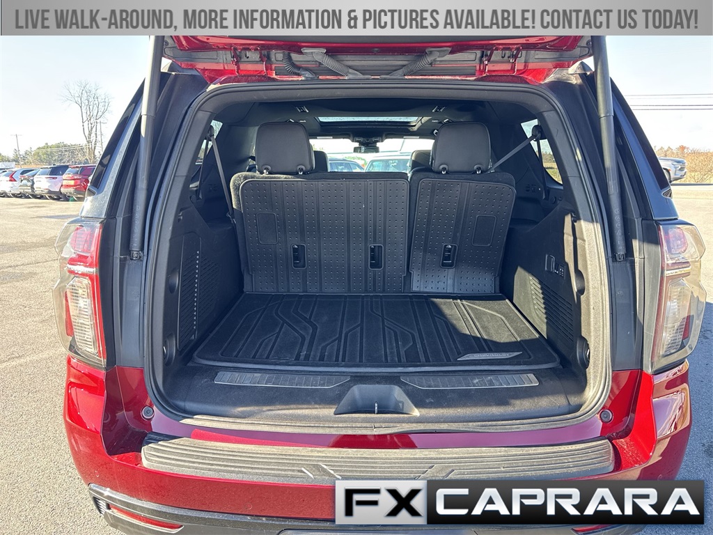 10-Way Power Driver & Passenger Seat Adjusters, 1st & 2nd Row Color-Keyed Carpeted Floor Mats, 2-Speed Active Electronic AutoTrac Transfer Case, 3.23 Rear Axle Ratio, 3rd row seats: split-bench, 4-Wheel Disc Brakes, 9 Speakers, ABS brakes, Air Conditioning, Alloy wheels, AM/FM radio: SiriusXM with 360L, Apple CarPlay/Android Auto, Auto High-beam Headlights, Auto-Dimming Inside Rear-View Mirror, Auto-dimming Rear-View mirror, Automatic temperature control, Black Tubular Assist Steps, Bose 9-Speaker Stereo Audio System Feature, Brake assist, Bright Front & Rear Door Sill Plates, Bumpers: body-color, Color-Keyed Carpeting Floor Covering, Compass, Delay-off headlights, Driver & Front Outboard Passenger Airbags, Driver door bin, Driver vanity mirror, Dual front impact airbags, Dual front side impact airbags, Electronic Stability Control, Emergency communication system: OnStar and Chevrolet connected services capable, Enhanced Driver Information Center, Floor Console w/Storage Area, Four wheel independent suspension, Front anti-roll bar, Front Bucket Seats, Front Center Armrest, Front dual zone A/C, Front High-Approach Angle Fascia, Front reading lights, Fully automatic headlights, Garage door transmitter, Hands-Free Rear Power Programmable Liftgate, Heated door mirrors, Heated Driver & Front Passenger Seats, Heated front seats, Heavy-Duty Air Filter, Hill Descent Control, Illuminated entry, Infotainment Display, Leather-Appointed Seating, LED Daytime Running Lamps, Low tire pressure warning, Memory seat, Memory Settings For Driver, Navigation System, Occupant sensing airbag, Outside temperature display, Overhead airbag, Overhead console, Panic alarm, Passenger door bin, Passenger vanity mirror, Power door mirrors, Power driver seat, Power Liftgate, Power passenger seat, Power steering, Power windows, Premium audio system: Chevrolet Infotainment 3 Premium, Premium Smooth Ride Suspension, Radio: Chevrolet Infotainment 3 Premium System, Rain sensing wipers, Rear air conditioning, Rear anti-roll bar, Rear reading lights, Rear seat center armrest, Rear window defroster, Rear window wiper, Red Recovery Hooks, Remote keyless entry, Remote Start, Roof rack: rails only, Security system, SiriusXM Radio w/360L, Speed control, Speed-sensing steering, Split folding rear seat, Spoiler, Steering wheel mounted audio controls, Tachometer, Telescoping steering wheel, Tilt steering wheel, Traction control, Trip computer, Universal Home Remote, Variably intermittent wipers, Voltmeter, Wheels: 20" x 9" Machined Aluminum, Wireless Charging, Wrapped Steering Wheel.