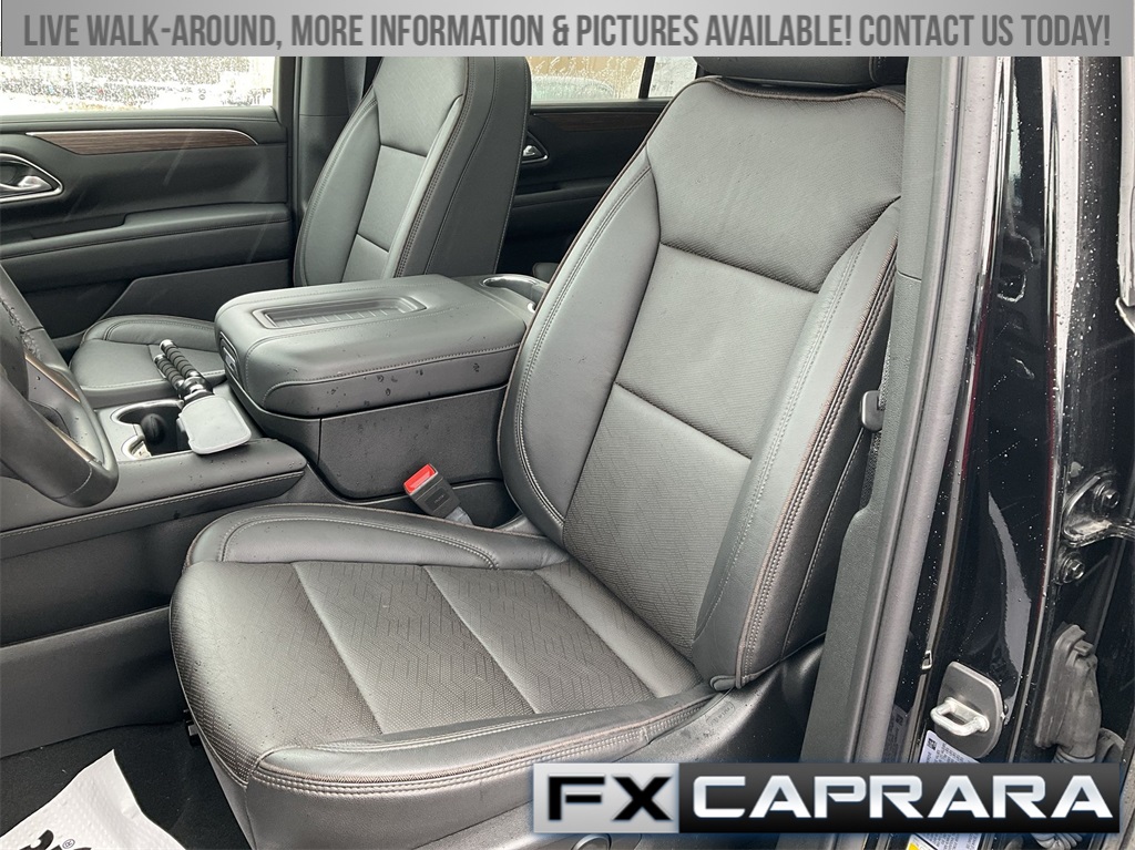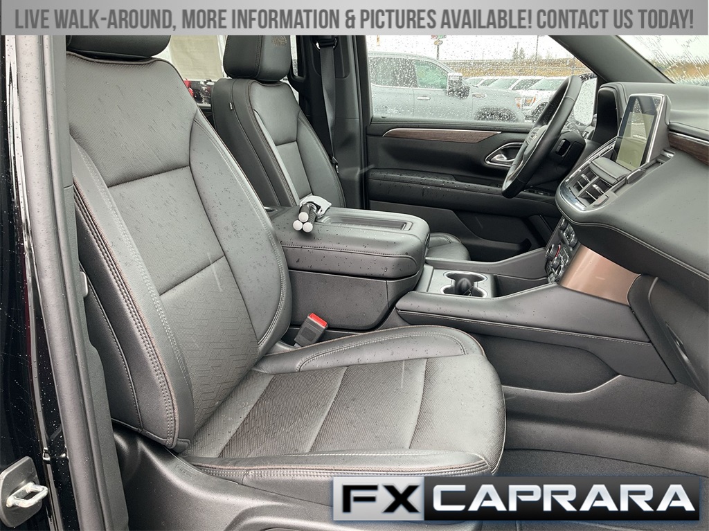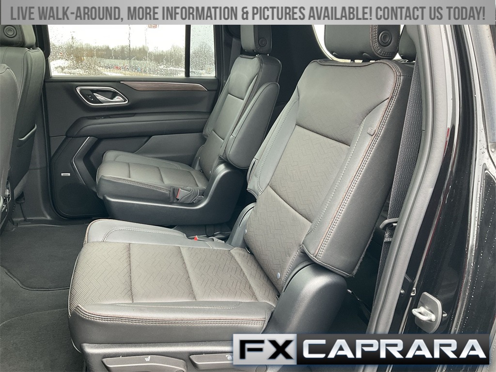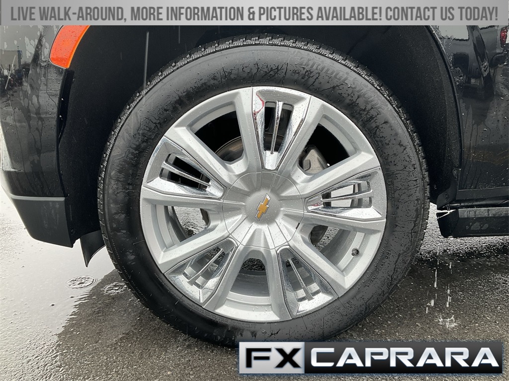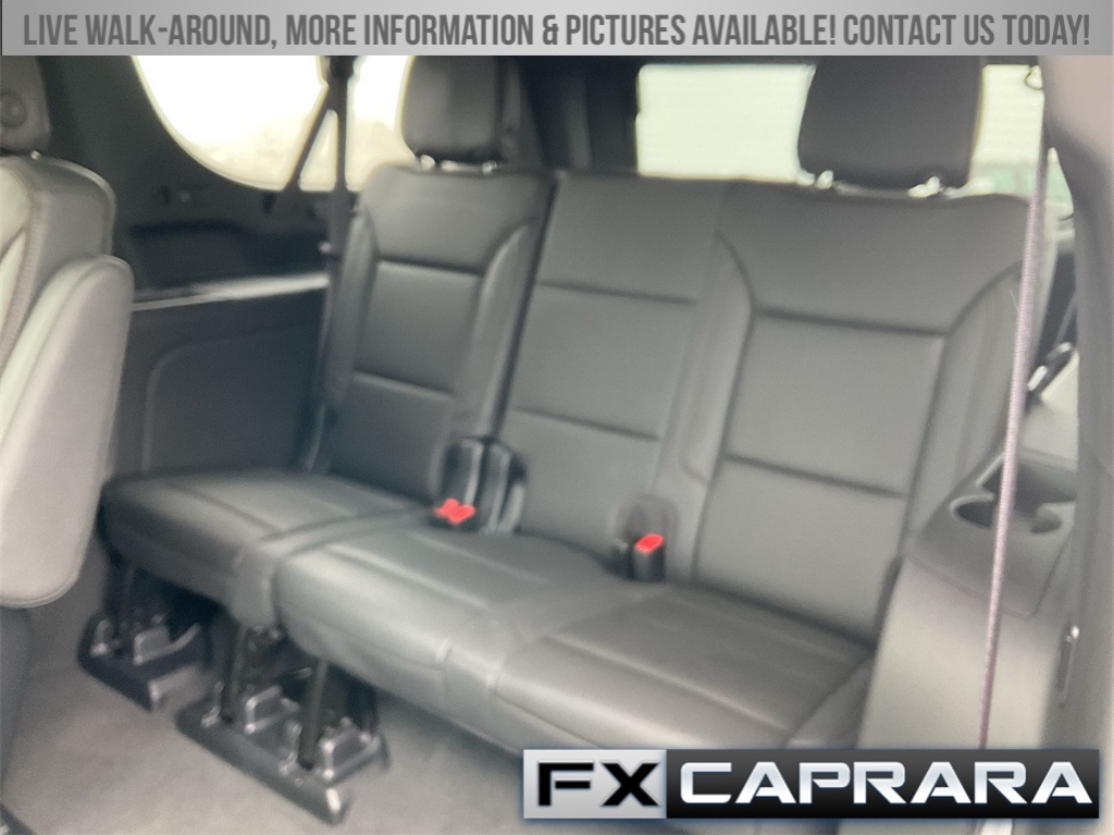 10 Speakers, 15" Diagonal Multi-Color Head-Up Display, 1st & 2nd Row Color-Keyed Carpeted Floor Mats, 2-Speed Active Electronic AutoTrac Transfer Case, 3.23 Rear Axle Ratio, 3rd Row 60/40 Power-Folding Split-Bench, 3rd row seats: split-bench, 4-Wheel Disc Brakes, ABS brakes, Adaptive suspension, Air Conditioning, Alloy wheels, AM/FM radio: SiriusXM with 360L, Apple CarPlay/Android Auto, Auto High-beam Headlights, Auto-dimming door mirrors, Auto-dimming Rear-View mirror, Auto-leveling suspension, Automatic temperature control, Bose 10-Speaker Surround w/CenterPoint, Brake assist, Bright Front & Rear Door Sill Plates, Bumpers: body-color, Chrome Door Handles w/Body-Color Strip, Color-Keyed Carpeting Floor Covering, Compass, Delay-off headlights, Driver & Front Outboard Passenger Airbags, Driver door bin, Driver vanity mirror, Dual Exhaust System, Dual front impact airbags, Dual front side impact airbags, Electronic Stability Control, Emergency communication system: OnStar and Chevrolet connected services capable, Enhanced Automatic Emergency Braking, Enhanced Driver Information Center, Exterior Parking Camera Rear, Floor Console, Four wheel independent suspension, Front anti-roll bar, Front Bucket Seats, Front Center Armrest, Front dual zone A/C, Front reading lights, Fully automatic headlights, Garage door transmitter, Hands-Free Rear Power Programmable Liftgate, HD Surround Vision, Heads-Up Display, Heated & Ventilated Driver & Front Passenger Seats, Heated 2nd Row Outboard Seats, Heated door mirrors, Heated Driver & Front Passenger Seats, Heated front seats, Heated rear seats, Heated Steering Wheel, Heated steering wheel, Hill Descent Control, Illuminated entry, Infotainment Display, Inside Rearview Auto-Dimming Rear Camera Mirror, Lane Change Alert w/Side Blind Zone Alert, LED Daytime Running Lamps, Low tire pressure warning, Magnetic Ride Control Suspension, Memory seat, Memory Settings, Navigation System, Occupant sensing airbag, Outside Heated Power-Adjustable Mirrors, Outside temperature display, Overhead airbag, Overhead console, Panic alarm, Passenger door bin, Passenger vanity mirror, Perforated Leather Seating Surfaces, Power door mirrors, Power driver seat, Power Liftgate, Power passenger seat, Power Release 2nd Row Bucket Seats, Power steering, Power Tilt & Telescopic Steering Column, Power windows, Premium audio system: Chevrolet Infotainment 3 Premium, Radio: Chevrolet Infotainment 3 Premium System, Rain sensing wipers, Rear air conditioning, Rear anti-roll bar, Rear Camera Mirror Washer, Rear Cross Traffic Alert, Rear Pedestrian Alert, Rear reading lights, Rear window defroster, Rear window wiper, Remote keyless entry, Remote Start, Roof rack: rails only, Safety Alert Seat, Security system, SiriusXM Radio w/360L, Speed control, Speed-sensing steering, Split folding rear seat, Spoiler, Steering wheel memory, Steering wheel mounted audio controls, Tachometer, Telescoping steering wheel, Tilt steering wheel, Traction control, Trip computer, Turn signal indicator mirrors, Universal Home Remote, Variably intermittent wipers, Ventilated front seats, Voltmeter, Wheel Locks (Set of 4) (LPO), Wheels: 22" x 9" Sterling Silver Premium Painted, Wireless Charging, Wrapped Steering Wheel.