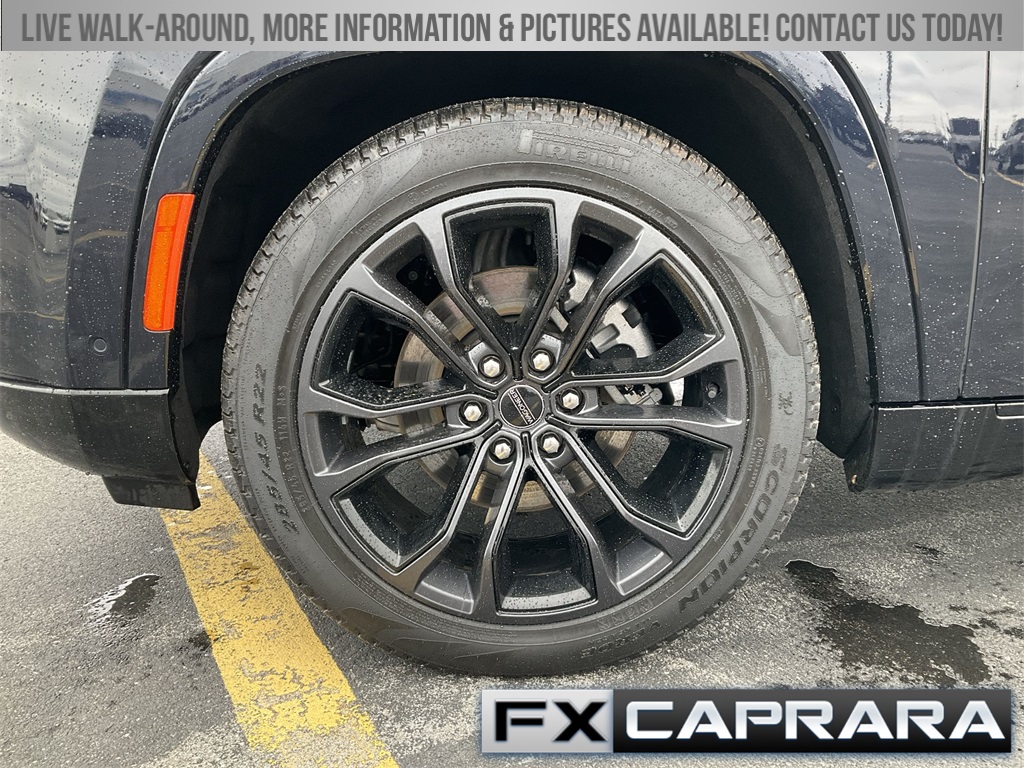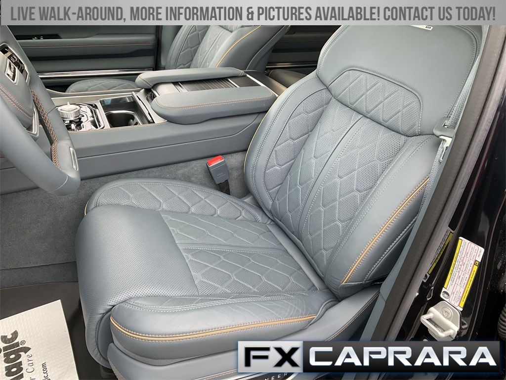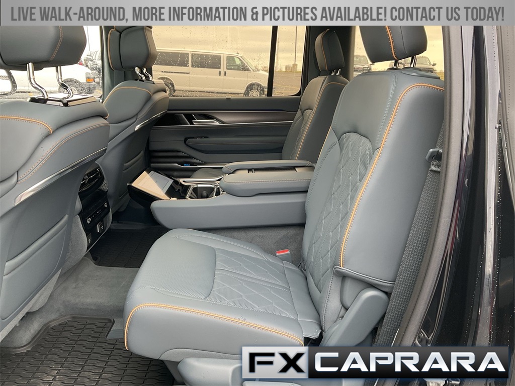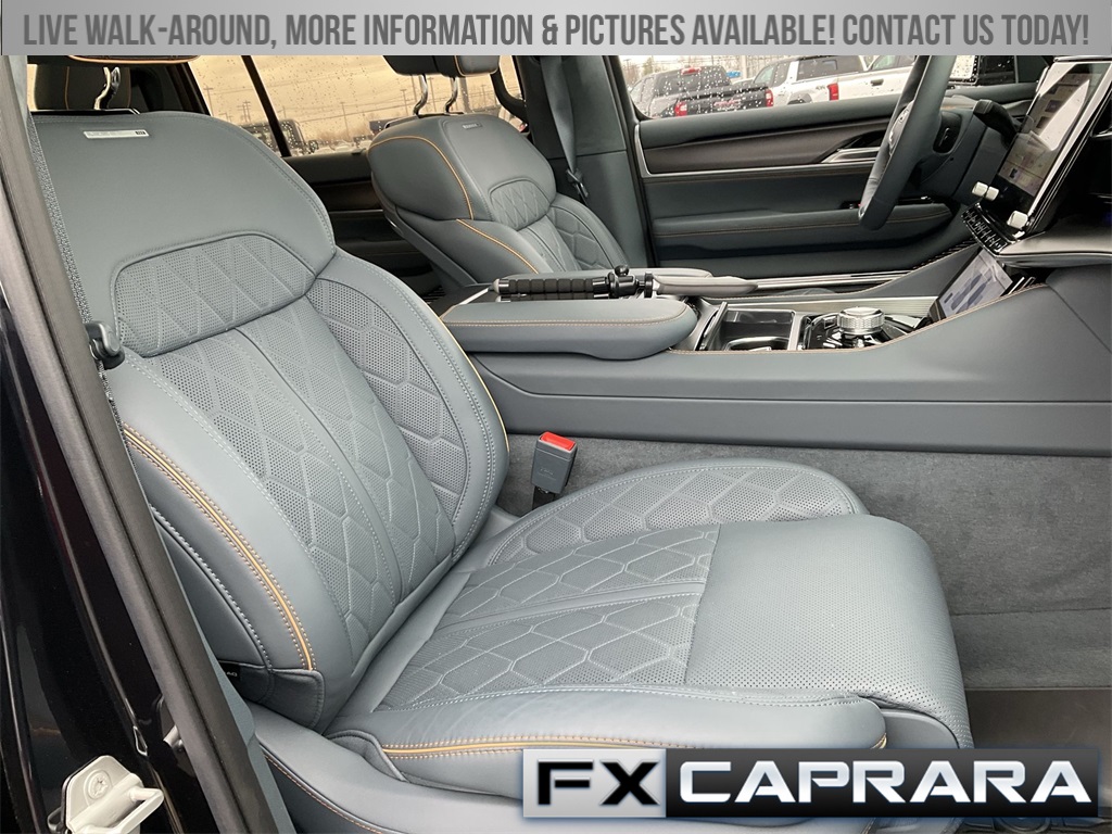 3.92 Rear Axle Ratio, 3rd row seats: bench, 4-Wheel Disc Brakes, ABS brakes, Adjustable pedals, Air Conditioning, Alloy wheels, AM/FM radio: SiriusXM with 360L, Anti-whiplash front head restraints, Audio memory, Auto High-beam Headlights, Auto-dimming door mirrors, Auto-dimming Rear-View mirror, Auto-leveling suspension, Automatic temperature control, Black Interior Accents, Brake assist, Bumpers: body-color, Compass, Delay-off headlights, Driver door bin, Driver vanity mirror, Driver's Seat Mounted Armrest, Dual front impact airbags, Dual front side impact airbags, Electronic Stability Control, Emergency communication system: Automatic SOS Call, Four wheel independent suspension, Front anti-roll bar, Front Bucket Seats, Front Center Armrest w/Storage, Front dual zone A/C, Front fog lights, Front reading lights, Fully automatic headlights, Garage door transmitter, Genuine wood console insert, Genuine wood dashboard insert, Genuine wood door panel insert, Gloss Black Upper & Lower DLO Molding, HD Trailer Tow Package, Heads-Up Display, Heated door mirrors, Heated front seats, Heated rear seats, Heated steering wheel, Heavy-Duty Engine Cooling, Illuminated entry, Knee airbag, Leather steering wheel, Low tire pressure warning, Memory seat, Navigation System, Night vision lights, Normal Duty Suspension, Obsidian Appearance Package, Occupant sensing airbag, Outside temperature display, Overhead airbag, Overhead console, Panic alarm, Passenger door bin, Passenger seat mounted armrest, Passenger vanity mirror, Pedal memory, Piano Black Exterior Accents, Power adjustable front head restraints, Power door mirrors, Power driver seat, Power Liftgate, Power moonroof, Power passenger seat, Power steering, Power windows, Premium Leather Trimmed Bucket Seats, Quick Order Package 28T Obsidian, Radio data system, Radio: Uconnect 5 Nav w/12.0" Display, Rain sensing wipers, Rear air conditioning, Rear anti-roll bar, Rear dual zone A/C, Rear reading lights, Rear seat center armrest, Rear window defroster, Rear window wiper, Reclining 3rd row seat, Remote keyless entry, Removable Rear Tow Hook, Roof rack, Security system, Speed control, Speed-sensing steering, Speed-Sensitive Wipers, Split folding rear seat, Steering wheel memory, Steering wheel mounted audio controls, Tachometer, Telescoping steering wheel, Tilt steering wheel, Traction control, Trailer Brake Control, Trailer Hitch Zoom, Trip computer, Turn signal indicator mirrors, Two Tone Paint Group, Variably intermittent wipers, Ventilated front seats, Ventilated rear seats, Voltmeter, Wheels: 22" x 9.0" Premium 4 Aluminum, Wheels: 22" x 9.0" Tinted Polished w/Black Insert.