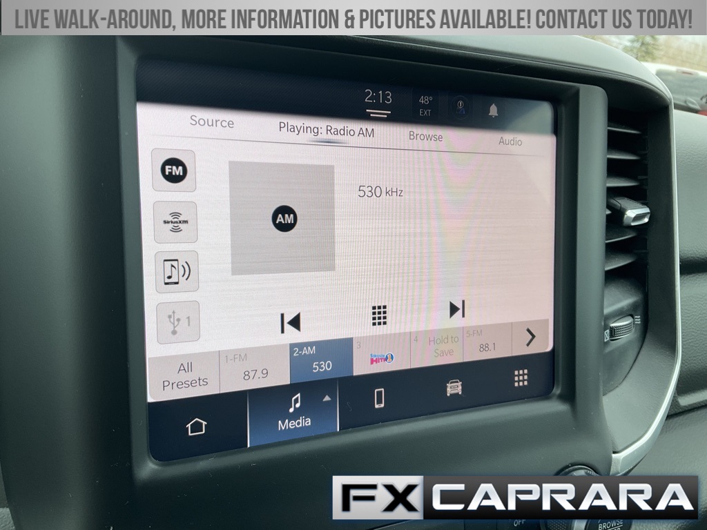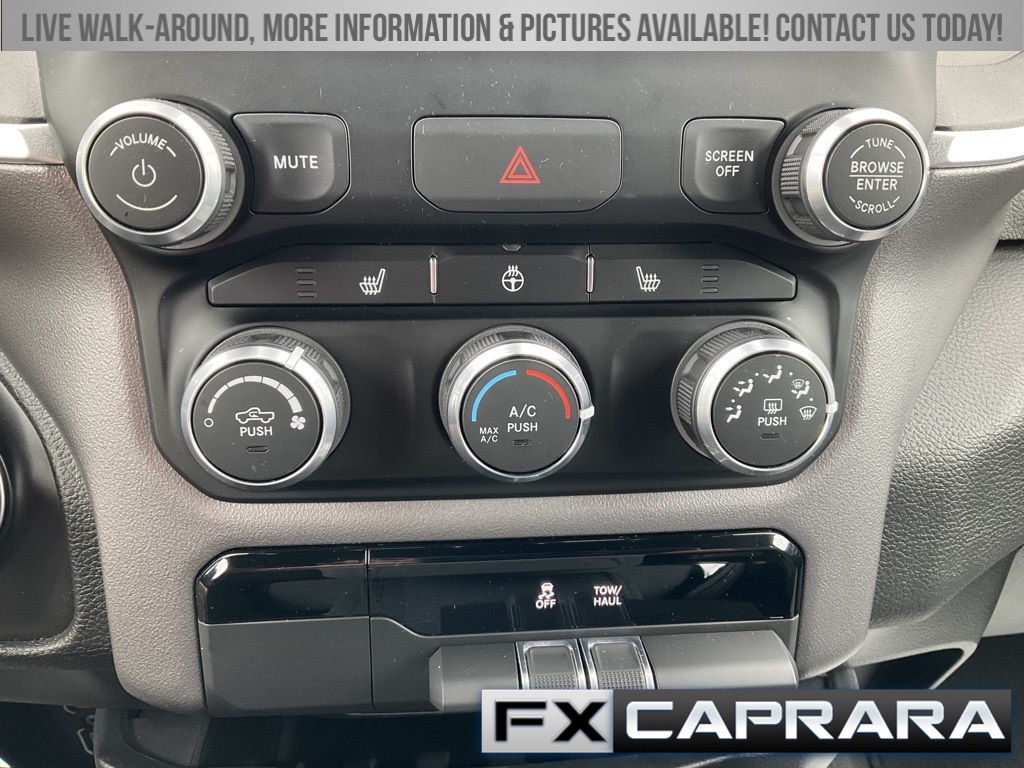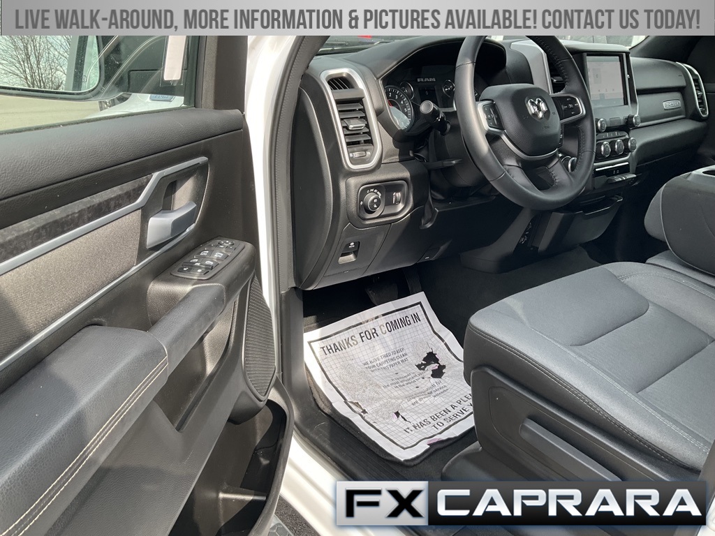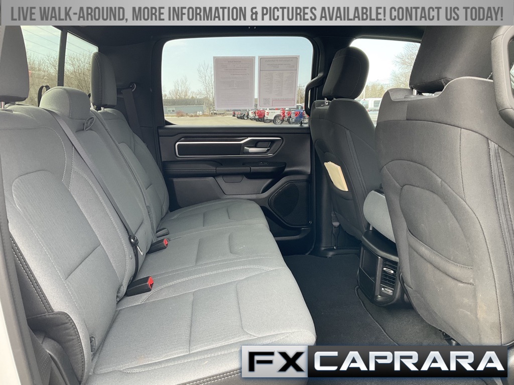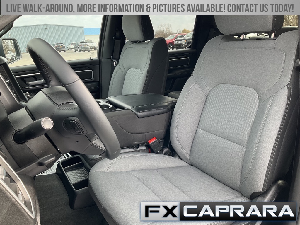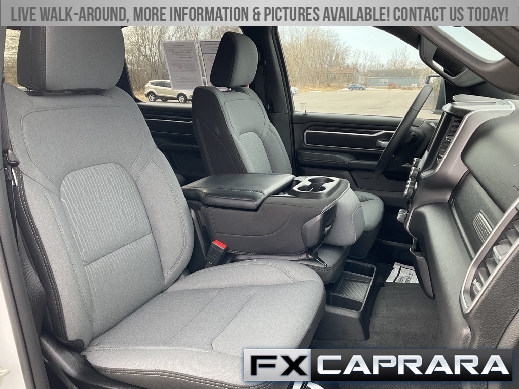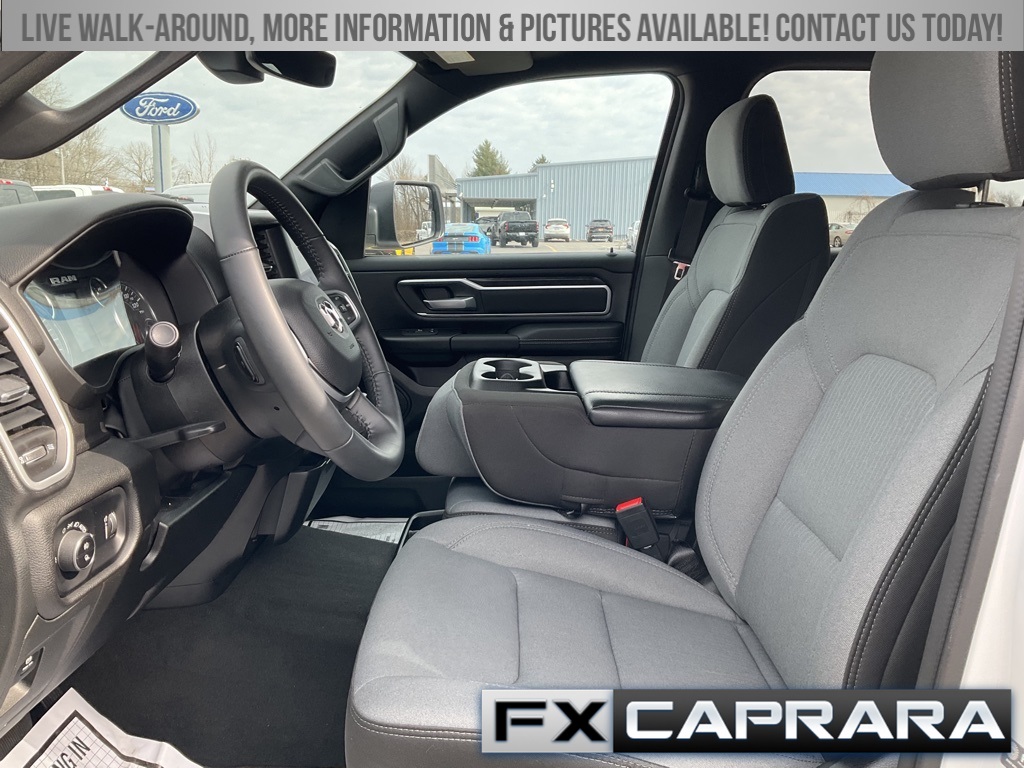 2nd Row In Floor Storage Bins, 3 Rear Seat Head Restraints, 3.21 Rear Axle Ratio, 4 Way Front Headrests, 4-Wheel Disc Brakes, 48V Belt Starter Generator, 4G LTE Wi-Fi Hot Spot, 6 Speakers, 8.4" Touchscreen Display, ABS brakes, Air Conditioning, Alloy wheels, AM/FM radio, Apple CarPlay, Auto-Dimming Exterior Driver Mirror, Auto-Dimming Rear-View Mirror, Big Horn Badge, Big Horn Level 1 Equipment Group, Black Exterior Mirrors, Black Premium Power Mirrors, Bluetooth Handsfree Phone & Audio, Brake assist, Bumpers: chrome, Class IV Receiver Hitch, Cloth Bench Seat, Compass, Connectivity - US/Canada, Convex Wide-Angle Exterior Mirror Insert, Delay-off headlights, Driver door bin, Dual front impact airbags, Dual front side impact airbags, Electric Shift-On-Demand Transfer Case, Electronic Stability Control, Emergency communication system: SiriusXM Guardian, Exterior Mirrors Courtesy Lamps, Exterior Mirrors w/Heating Element, Exterior Mirrors w/Supplemental Signals, For Details, Visit DriveUconnect.com, For More Info, Call 800-643-2112, Front anti-roll bar, Front Center Armrest w/Storage, Front Fog Lamps, Front License Plate Bracket, Front reading lights, Front Seat Back Map Pockets, Front wheel independent suspension, Fully automatic headlights, Global Telematics Box Module (TBM), Glove Box Lamp, Google Android Auto, GPS Antenna Input, Heated door mirrors, Heated Front Seats, Heated Steering Wheel, Illuminated entry, Integrated Center Stack Radio, Integrated Voice Command w/Bluetooth, Leather steering wheel, Low tire pressure warning, Occupant sensing airbag, Outside temperature display, Overhead airbag, Overhead console, Panic alarm, ParkView Rear Back-Up Camera, Passenger door bin, Passenger Sun Visor w/Illuminated Mirror, Passenger vanity mirror, Power door mirrors, Power steering, Power windows, Power-Folding Mirrors, Quick Order Package 23Z Big Horn, Radio data system, Radio: Uconnect 3 w/5" Display, Radio: Uconnect 5 W w/8.4" Display, RAM Grille Badge - Chrome, Rear 60/40 Folding Seat, Rear anti-roll bar, Rear Dome w/On/Off Switch Lamp, Rear Power Sliding Window, Rear seat center armrest, Rear step bumper, Rear Window Defroster, Remote keyless entry, Remote Start System, SiriusXM Satellite Radio, Speed control, Split folding rear seat, Steering wheel mounted audio controls, Tachometer, Telescoping steering wheel, Tilt steering wheel, Traction control, Trip computer, USB Host Flip, Variably intermittent wipers, Voltmeter, Wheel to Wheel Side Steps, Wheels: 18" x 8" Cast-Aluminum Painted.
