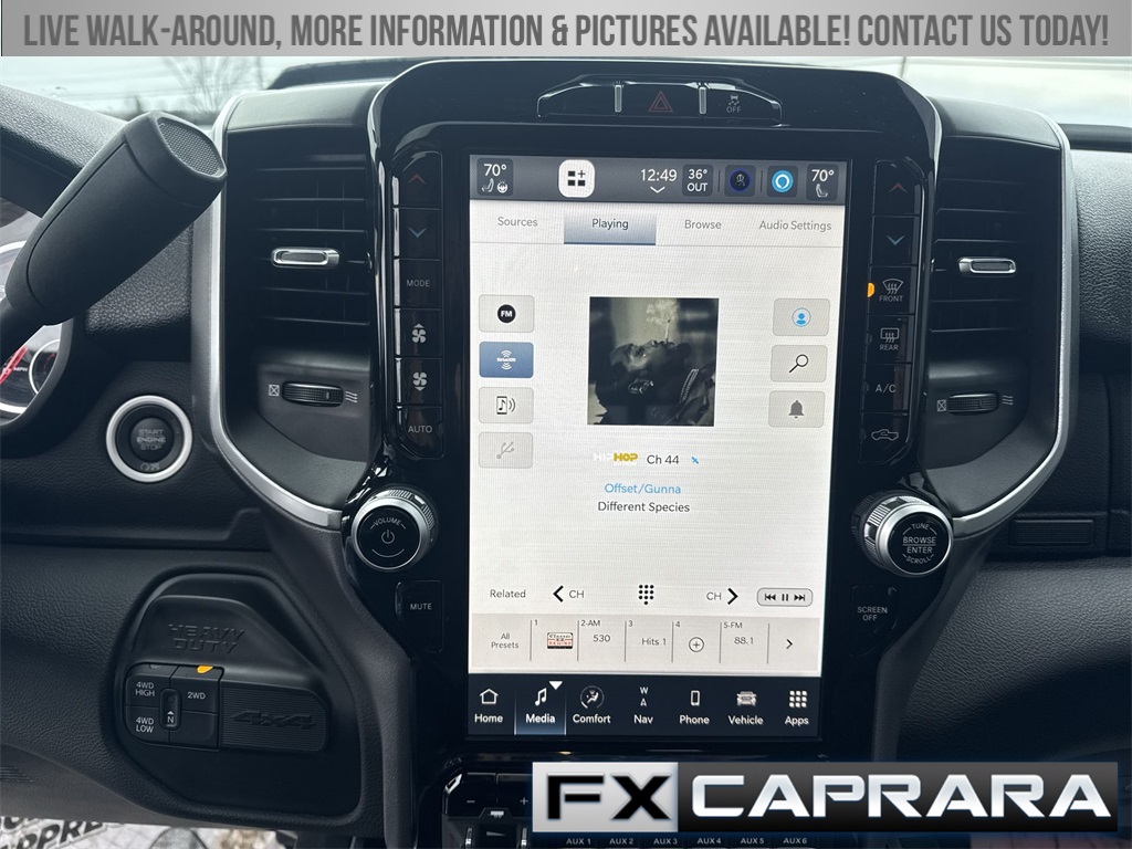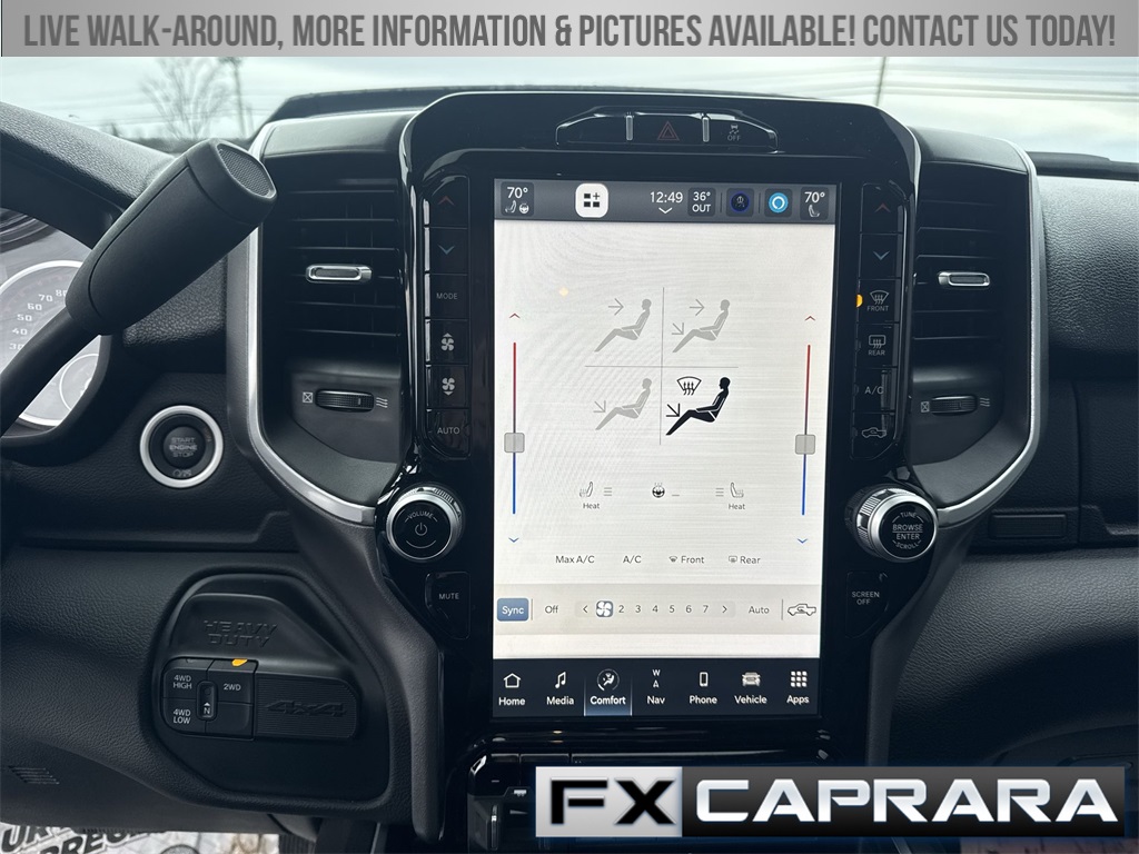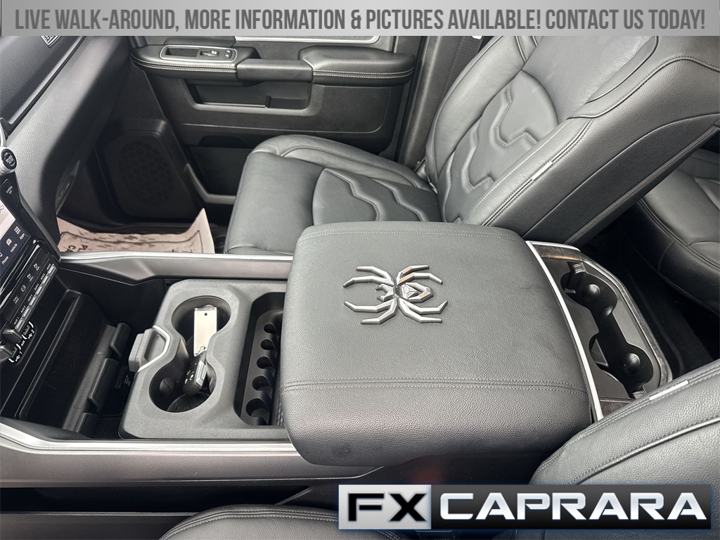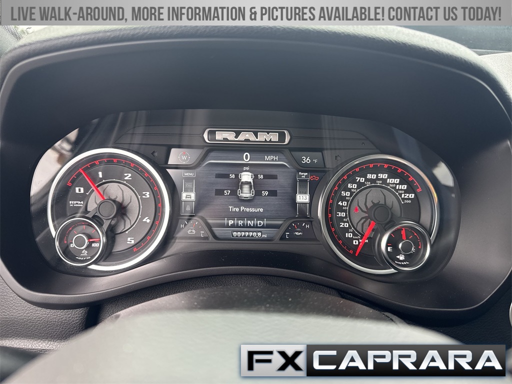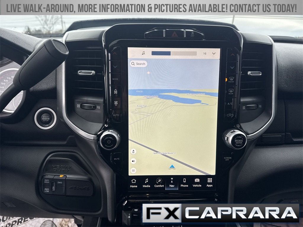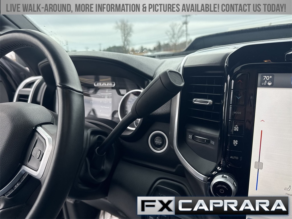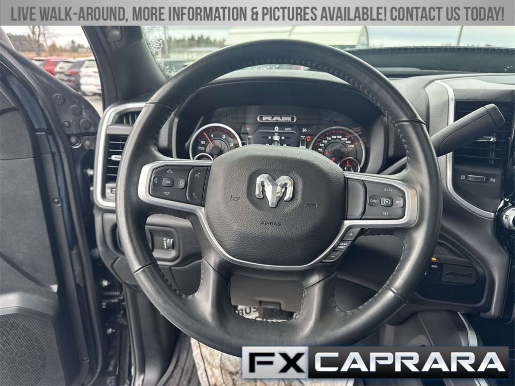115V Auxiliary Front Power Outlet, 12" Touchscreen Display, 2 Way Rear Headrest Seat, 220 Amp Alternator, 2nd Row In Floor Storage Bins, 3.73 Axle Ratio, 4 Way Front Headrests, 4-Wheel Disc Brakes, 40/20/40 Split Bench Seat, 400W Inverter, 4G LTE Wi-Fi Hot Spot, 5th Wheel/Gooseneck Towing Prep Group, 6 Speakers, 9 Alpine Speakers w/Subwoofer, ABS brakes, Active Noise Control System, Air Conditioning, Air Conditioning ATC w/Dual Zone Control, Alexa Built-In, All R1 High Radios, All Radio Equipped Vehicles, Alloy wheels, Anti-Spin Differential Rear Axle, Apple CarPlay, Auto Power-Folding Mirrors, Auto-dimming Rear-View mirror, Bed Utility Group, Big Horn IP Badge, Black Exterior Mirrors, Black Interior Accents, Blind Spot & Cross Path Detection, Bluetooth Handsfree Phone & Audio, Body Color Door Handles, Body Color Grille Surround, Brake assist, Bumpers: chrome, Center Hub, Center Stack Storage Drawer, Clearance Lamps, Cloth 40/20/40 Bench Seat, Cluster 7.0" TFT Color Display, Cold Weather Group, Compass, Connected Travel & Traffic Services, Connectivity - US/Canada, Dampened Tailgate, Dash Pass Thru Wire Circuits, Delay-off headlights, Disassociated Touchscreen Display, Driver door bin, Dual front impact airbags, Dual front side impact airbags, Dual Glove Boxes, Electronic Stability Control, Electronically Controlled Throttle, Emergency communication system: SiriusXM Guardian, Engine Block Heater, Exterior 115V AC Outlet, Exterior Mirrors Courtesy Lamps, Exterior Mirrors w/Heating Element, Exterior Mirrors w/Supplemental Signals, Foam Bottle Insert (Door Trim Panel), Footwell Courtesy Lamp, For Details, Visit DriveUconnect.com, For More Info, Call 800-643-2112, Forward & Reverse Utility Lights, Front anti-roll bar, Front Armrest w/Cupholders, Front Center Armrest w/Storage, Front Center Seat Cushion Storage, Front Fog Lamps, Front LED Fog Lamps, Front License Plate Bracket, Front reading lights, Front Seat Back Map Pockets, Fully automatic headlights, Global Telematics Box Module (TBM), Glove Box Lamp, Google Android Auto, GPS Antenna Input, GPS Navigation, HD Radio, Heated door mirrors, Heated Front Seats, Heated Steering Wheel, I/P Mounted Auxiliary Switches, Illuminated entry, Integrated Center Stack Radio, Integrated Voice Command w/Bluetooth, Leather Wrapped Steering Wheel, LED Bed Lighting, LED Reflector Headlamps, LED Tail Lamps, Level B Equipment Group, Locking Lower Glove Box, Low tire pressure warning, Manual Adjust 4-Way Driver Seat, Manual Adjust 4-Way Front Passenger Seat, Manufacturer's Statement of Origin, Media Hub w/2 Charge Only USBs, Mirror Running Lights, MOPAR Deployable Bed Step, MOPAR Front & Rear Rubber Floor Mats, MOPAR Spray In Bedliner, MOPAR Winter Front Grille Cover, Occupant sensing airbag, Off-Road Information Pages, Outside temperature display, Overhead airbag, Overhead console, Painted Front Bumper, Painted Rear Bumper, Panic alarm, ParkSense Front/Rear Park Assist System, ParkView Rear Back-Up Camera, Passenger door bin, Passenger vanity mirror, Power 2-Way Driver Lumbar Adjust, Power Adjust 8-Way Driver Seat, Power Adjust Mirrors, Power Adjustable Convex Aux Mirrors, Power Adjustable Pedals, Power door mirrors, Power Heated Fold Telescope Mirrors, Power steering, Power Sunroof, Power Telescoping Mirrors, Power windows, Premium Cloth 40/20/40 Bench Seat, Premium Lighting Group, Quick Order Package 2HZ Big Horn, Radio data
