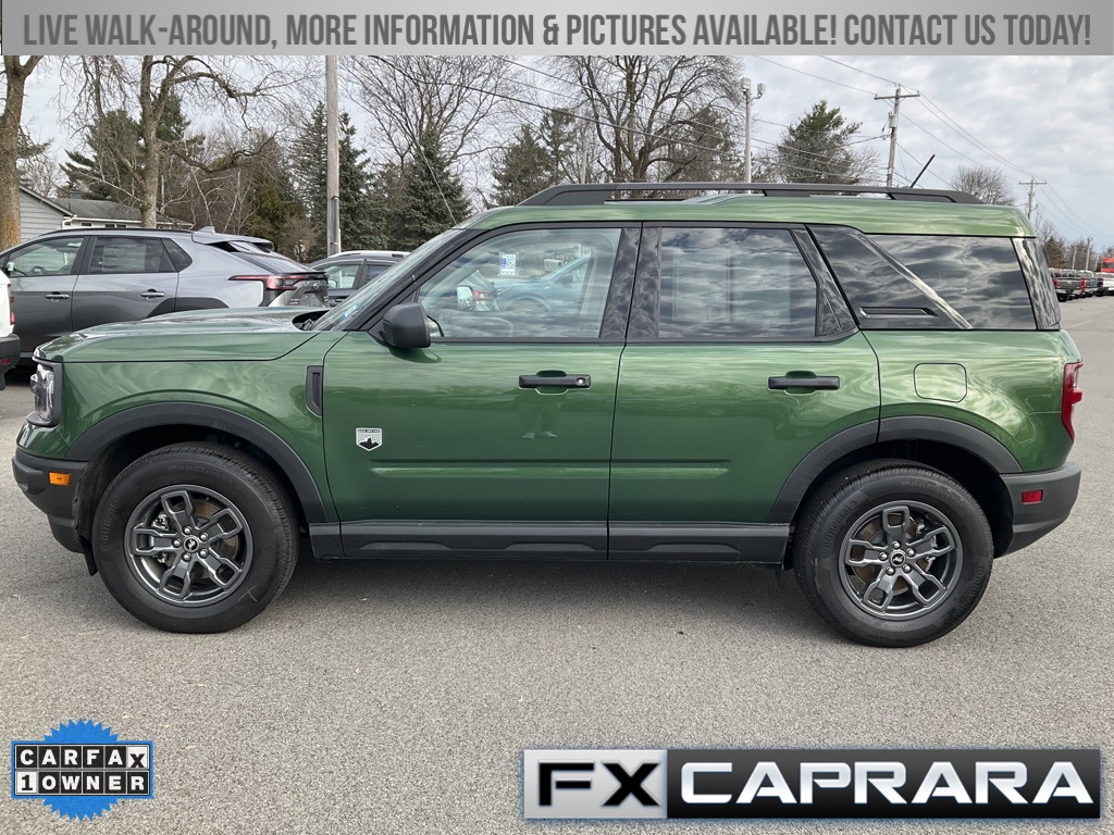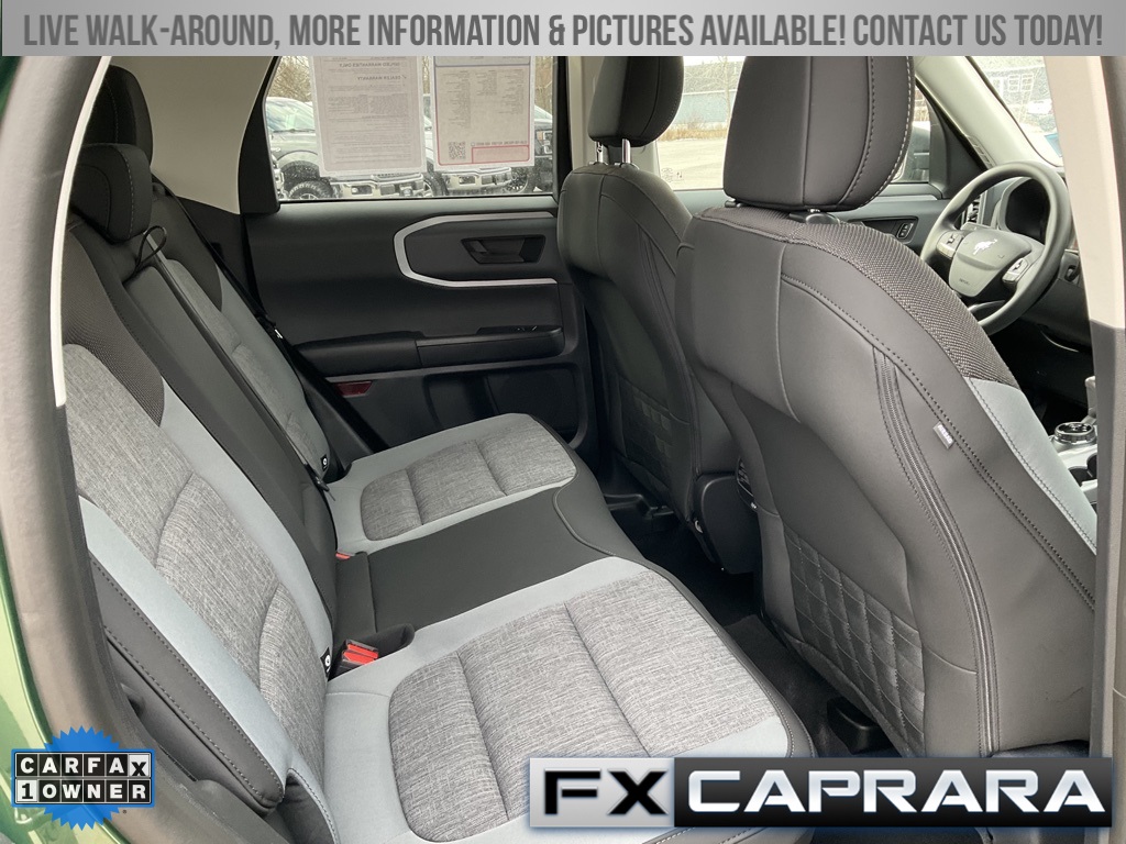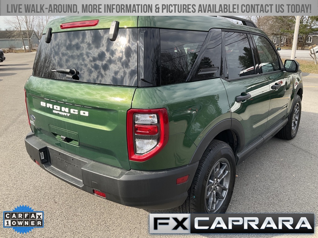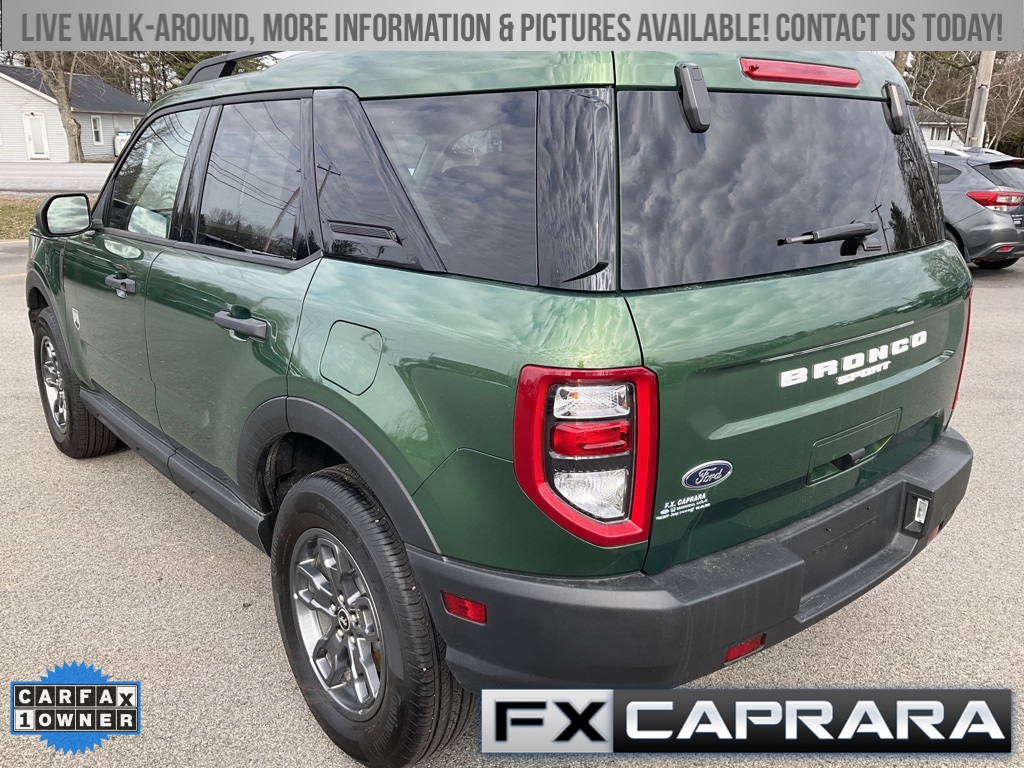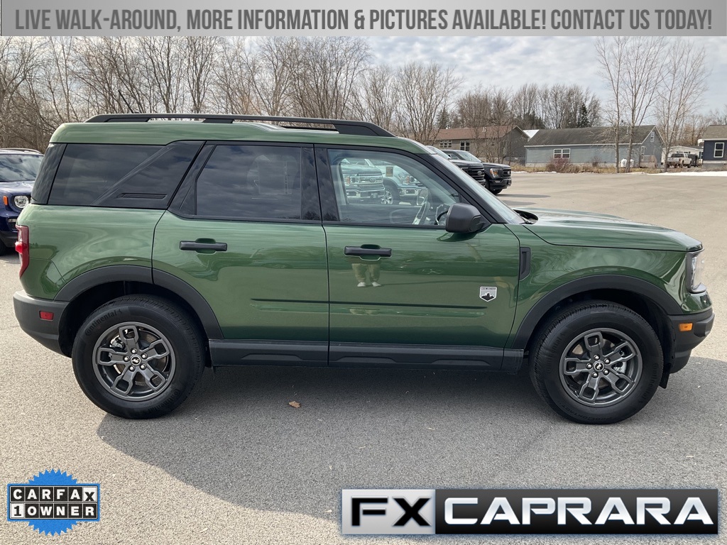 Bronco Sport Big Bend, 4D Sport Utility, 1.5L EcoBoost, 4WD, Eruption Green Metallic, Medium Dark Slate Cloth, Equipment Group 200A, Heated door mirrors, 3.80 Axle Ratio, 4-Wheel Disc Brakes, 6 Speakers, ABS brakes, Air Conditioning, Alloy wheels, AM/FM radio: SiriusXM, AM/FM Stereo, Auto High-beam Headlights, Automatic temperature control, Brake assist, Compass, Delay-off headlights, Driver door bin, Driver vanity mirror, Dual front impact airbags, Dual front side impact airbags, Electronic Stability Control, Emergency communication system: SYNC 3 911 Assist, Four wheel independent suspension, Front anti-roll bar, Front Bucket Seats, Front Center Armrest, Front License Plate Bracket, Front reading lights, Fully automatic headlights, Illuminated entry, Knee airbag, Low tire pressure warning, Occupant sensing airbag, Outside temperature display, Overhead airbag, Overhead console, Panic alarm, Passenger door bin, Passenger vanity mirror, Power door mirrors, Power steering, Power windows, Radio data system, Rear anti-roll bar, Rear reading lights, Rear seat center armrest, Rear window defroster, Rear window wiper, Remote keyless entry, Security system, SiriusXM, Speed control, Speed-sensing steering, Speed-Sensitive Wipers, Split folding rear seat, Steering wheel mounted audio controls, SYNC 3 Communications & Entertainment System, Tachometer, Telescoping steering wheel, Tilt steering wheel, Traction control, Trip computer, Unique Cloth Front Bucket Seats, Variably intermittent wipers, Wheels: 17" Carbonized Gray-Painted Aluminum, Bronco Sport Big Bend, 4D Sport Utility, 1.5L EcoBoost, 4WD, Eruption Green Metallic, Medium Dark Slate Cloth, Equipment Group 200A, Heated door mirrors.