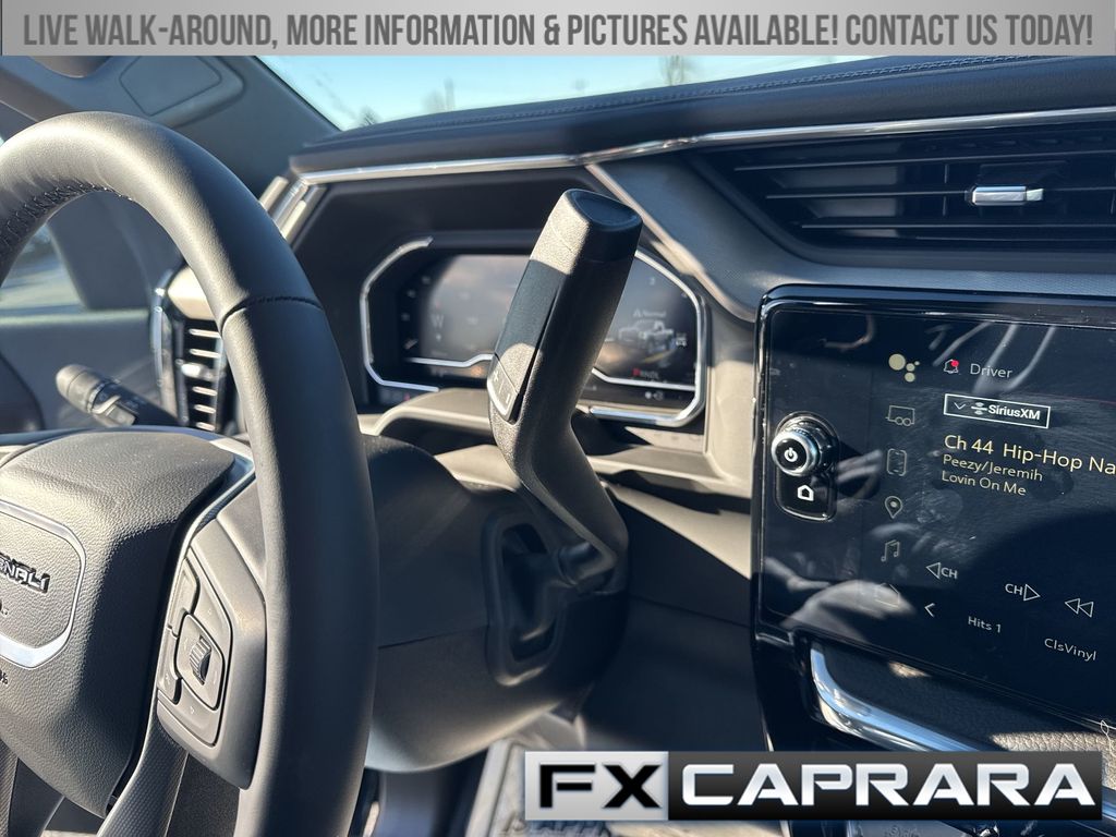 10-Speed Automatic, 4WD, Leather, 12-Way Power Driver Seat Adjuster w/Lumbar, 12-Way Power Passenger Seat Adjuster w/Lumbar, 120-Volt Bed Mounted Power Outlet, 120-Volt Instrument Panel Power Outlet, 2 Charge-Only Rear USB Ports, 2 Charge/Data USB Ports Inside Center Console, 2 USB Ports, 2-Speed Active Transfer Case, 3.73 Rear Axle Ratio, 4-Wheel Disc Brakes, 7 Speakers, ABS brakes, Air Conditioning, Alloy wheels, AM/FM radio: SiriusXM with 360L, Apple CarPlay/Android Auto, Auto High-beam Headlights, Auto-dimming door mirrors, Auto-dimming Rear-View mirror, Automatic Emergency Braking, Automatic temperature control, Bed View Camera w/2 Trailer Camera Provisions, Bose Premium 7-Speaker Sound System, Brake assist, Buckle to Drive, Bumpers: body-color, Compass, Deep-Tinted Glass, Delay-off headlights, Driver door bin, Driver Memory, Driver vanity mirror, Dual front impact airbags, Dual front side impact airbags, Electric Rear-Window Defogger, Electronic Stability Control, Emergency communication system: OnStar, Floor-Mounted Center Console, Following Distance Indicator, Forge Perforated Leather-Appointed Front Seat Trim, Forward Collision Alert, Front anti-roll bar, Front Bucket Seats, Front Center Armrest, Front dual zone A/C, Front fog lights, Front Pedestrian Braking, Front Rain-Sensing Wipers, Front reading lights, Front wheel independent suspension, Fully automatic headlights, Garage door transmitter, Genuine wood dashboard insert, Genuine wood door panel insert, HD Surround Vision, Heated 2nd Row Outboard Seats, Heated door mirrors, Heated Driver & Front Outboard Passenger Seats, Heated front seats, Heated rear seats, Heated steering wheel, Heavy-Duty 80 Amp Battery, Hill Descent Control, Hitch Guidance w/Hitch View, Illuminated entry, In-Vehicle Trailering System App, IntelliBeam Automatic High Beam On/Off, Keyless Open & Start, Lane Departure Warning System, LED Cargo Area Lighting, LED Smoked Amber Roof Marker Lamps, Low tire pressure warning, Manual Tilt-Wheel/Telescoping Steering Column, Memory seat, Occupant sensing airbag, Off-Road Suspension, OnStar Services Capable, Outside temperature display, Overhead airbag, Overhead console, Panic alarm, Passenger door bin, Passenger vanity mirror, Pickup Box, Polished Exhaust Tip, Power door mirrors, Power driver seat, Power Front Passenger Windows w/Express Up/Down, Power passenger seat, Power Sliding Rear Window w/Defogger, Power steering, Power windows, Push Button Start, Radio: AM/FM w/Premium GMC Infotainment System, Rain sensing wipers, Rear Cross Traffic Alert, Rear reading lights, Rear seat center armrest, Rear step bumper, Rear Wheelhouse Liners, Rear window defroster, Remote keyless entry, Remote Vehicle Starter System, Safety Alert Seat, Security system, Signature Chrome Denali Grille, SiriusXM w/360L Trial Subscription, Speed control, Speed-sensing steering, Split folding rear seat, Spray-On Pickup Bedliner w/GMC Logo, Steering Wheel Audio Controls, Steering wheel mounted audio controls, Tachometer, Telescoping steering wheel, Tilt steering wheel, Traction control, Trailer Cam Provisions & Trailer Viewing Software, Trailer Side Blind Zone Alert, Trip computer, Turn signal indicator mirrors, Ultrasonic Front & Rear Park Assist, Unauthorized Entry Theft-Deterrent System, Universal Home Remote, Variably intermittent wipers, Ventilated Driver & Front Passenger Seats, Ventilated front seats, Voltmeter, Wheels: 20" Ultra Bright Machi