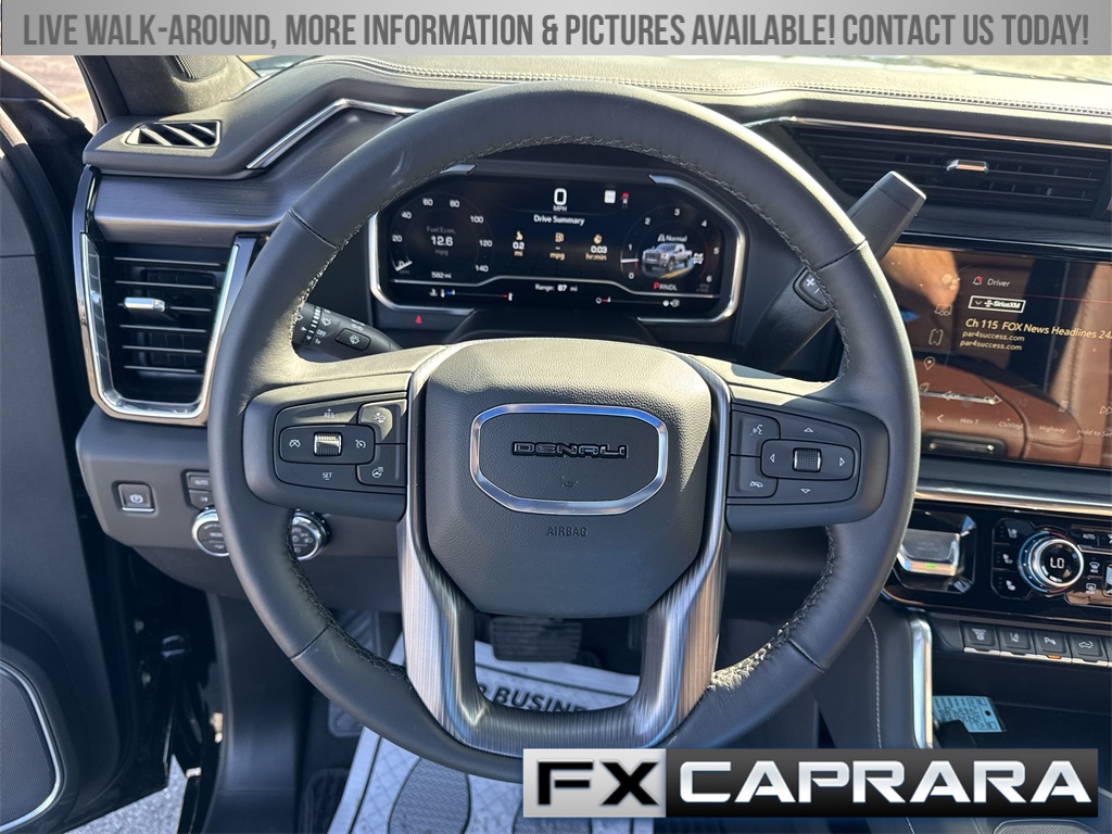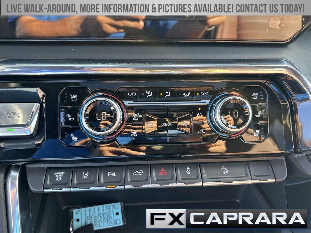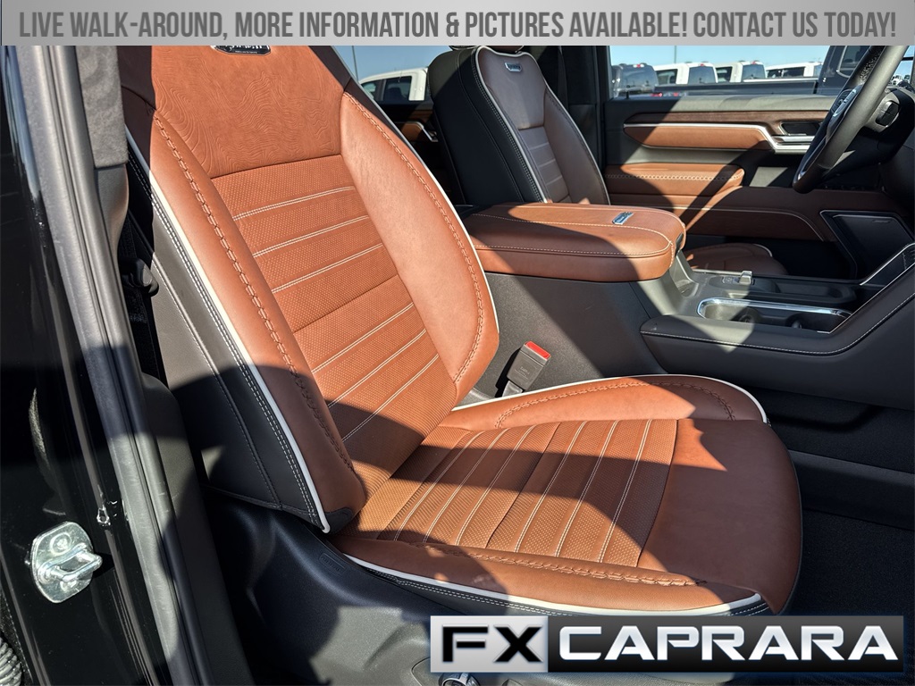 10-Speed Automatic, 4WD, Leather, 12 Speakers, 120-Volt Bed Mounted Power Outlet, 120-Volt Instrument Panel Power Outlet, 16-Way Power Driver Seat Adjuster w/Lumbar, 16-Way Power Passenger Seat Adjuster w/Lumbar, 2 Charge-Only Rear USB Ports, 2 Charge/Data USB Ports Inside Center Console, 2 USB Ports, 2-Speed Active Transfer Case, 220-Amp Alternator, 3.42 Axle Ratio, 4-Wheel Disc Brakes, ABS brakes, Air Conditioning, Alloy wheels, AM/FM radio: SiriusXM with 360L, Apple CarPlay/Android Auto, Auto High-beam Headlights, Auto-dimming door mirrors, Auto-dimming Rear-View mirror, Automatic Emergency Braking, Automatic temperature control, Bed View Camera w/2 Trailer Camera Provisions, Block heater, Bose Premium Series 12-Speaker System, Brake assist, Buckle to Drive, Bumpers: body-color, Compass, Deep-Tinted Glass, Delay-off headlights, Driver door bin, Driver Memory, Driver vanity mirror, Dual front impact airbags, Dual front side impact airbags, Dual Heavy-Duty 70 Amp Battery, Electric Rear-Window Defogger, Electronic Stability Control, Emergency communication system: OnStar, Floor-Mounted Center Console, Following Distance Indicator, Forward Collision Alert, Front anti-roll bar, Front Bucket Seats, Front Center Armrest, Front dual zone A/C, Front fog lights, Front Pedestrian Braking, Front Rain-Sensing Wipers, Front reading lights, Front wheel independent suspension, Full Grain Leather Seat Trim, Fully automatic headlights, Garage door transmitter, Genuine wood dashboard insert, Genuine wood door panel insert, HD Surround Vision, Heads-Up Display, Heated 2nd Row Outboard Seats, Heated door mirrors, Heated Driver & Front Outboard Passenger Seats, Heated front seats, Heated rear seats, Heated steering wheel, Hill Descent Control, Hitch Guidance w/Hitch View, Illuminated entry, In-Vehicle Trailering System App, Inside Rearview Auto-Dimming Rear Camera Mirror, IntelliBeam Automatic High Beam On/Off, Keyless Open & Start, Lane Departure Warning System, Leather steering wheel, LED Cargo Area Lighting, LED Smoked Amber Roof Marker Lamps, Low tire pressure warning, Manual Tilt-Wheel/Telescoping Steering Column, Memory seat, Multicolor 15" Diagonal Head-Up Display, Occupant sensing airbag, Off-Road Suspension, OnStar Services Capable, Outside temperature display, Overhead airbag, Overhead console, Panic alarm, Passenger door bin, Passenger vanity mirror, Pickup Box, Power door mirrors, Power driver seat, Power Front Passenger Windows w/Express Up/Down, Power moonroof, Power passenger seat, Power Sliding Rear Window w/Defogger, Power steering, Power Sunroof, Power windows, Push Button Start, Radio: AM/FM w/Premium GMC Infotainment System, Rain sensing wipers, Rear Cross Traffic Alert, Rear reading lights, Rear seat center armrest, Rear step bumper, Rear Wheelhouse Liners, Rear window defroster, Remote keyless entry, Remote Vehicle Starter System, Safety Alert Seat, Security system, Signature Denali Ultimate Grille in Vadar Chrome, SiriusXM w/360L Trial Subscription, Speed control, Speed-sensing steering, Split folding rear seat, Spray-On Pickup Bedliner w/GMC Logo, Steering Wheel Audio Controls, Steering wheel mounted audio controls, Tachometer, Technology Package, Telescoping steering wheel, Tilt steering wheel, Traction control, Trailer Cam Provisions & Trailer Viewing Software, Trailer Side Blind Zone Alert, Trailer Tire Pressure Monitor Sensors, Trip computer, Turn signal indicator mirrors