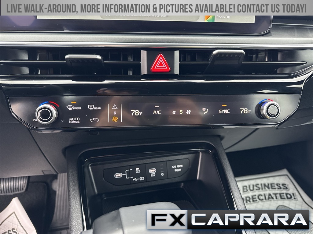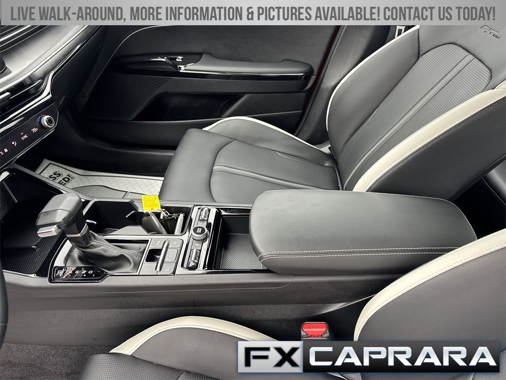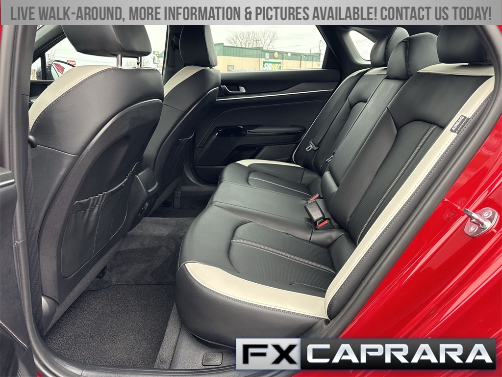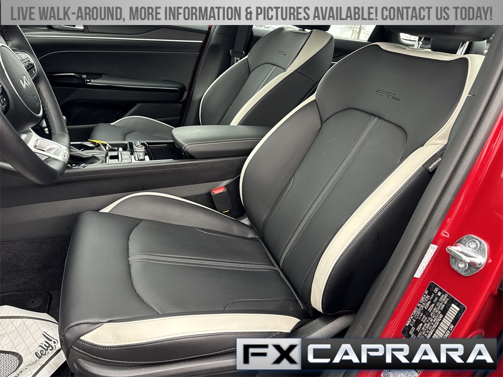 4-Wheel Disc Brakes, 6 Speakers, ABS brakes, Air Conditioning, Alloy wheels, AM/FM radio: SiriusXM, Apple CarPlay & Android Auto, Auto High-beam Headlights, Automatic temperature control, Brake assist, Bumpers: body-color, Carpeted Floor Mats, Delay-off headlights, Driver door bin, Driver vanity mirror, Dual front impact airbags, Dual front side impact airbags, Electronic Stability Control, Emergency communication system: Kia Connect (includes 1 year free trial), Four wheel independent suspension, Front anti-roll bar, Front Bucket Seats, Front Center Armrest, Front dual zone A/C, Front fog lights, Front reading lights, Fully automatic headlights, Heated door mirrors, Heated Front Bucket Seats, Heated front seats, Heated steering wheel, Illuminated entry, Knee airbag, Leather Shift Knob, Leather steering wheel, Low tire pressure warning, Navigation System, Occupant sensing airbag, Outside temperature display, Overhead airbag, Overhead console, Panic alarm, Passenger door bin, Passenger vanity mirror, Power door mirrors, Power driver seat, Power steering, Power windows, Radio data system, Radio: AM/FM Audio System, Rear anti-roll bar, Rear seat center armrest, Rear side impact airbag, Rear window defroster, Remote keyless entry, Security system, Speed control, Speed-sensing steering, Split folding rear seat, Sport steering wheel, Steering wheel mounted audio controls, Tachometer, Telescoping steering wheel, Tilt steering wheel, Traction control, Trip computer, Turn signal indicator mirrors, Variably intermittent wipers, Wheels: 18" x 7.5J Gloss Black Machined Finish Alloy.