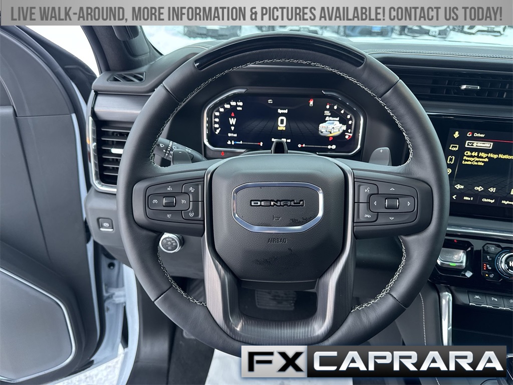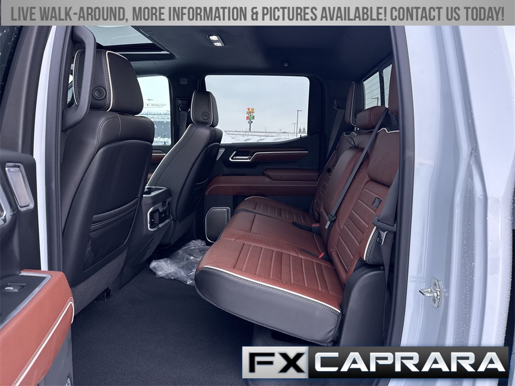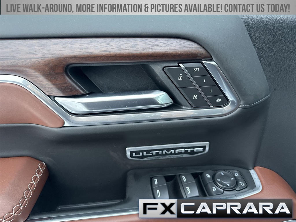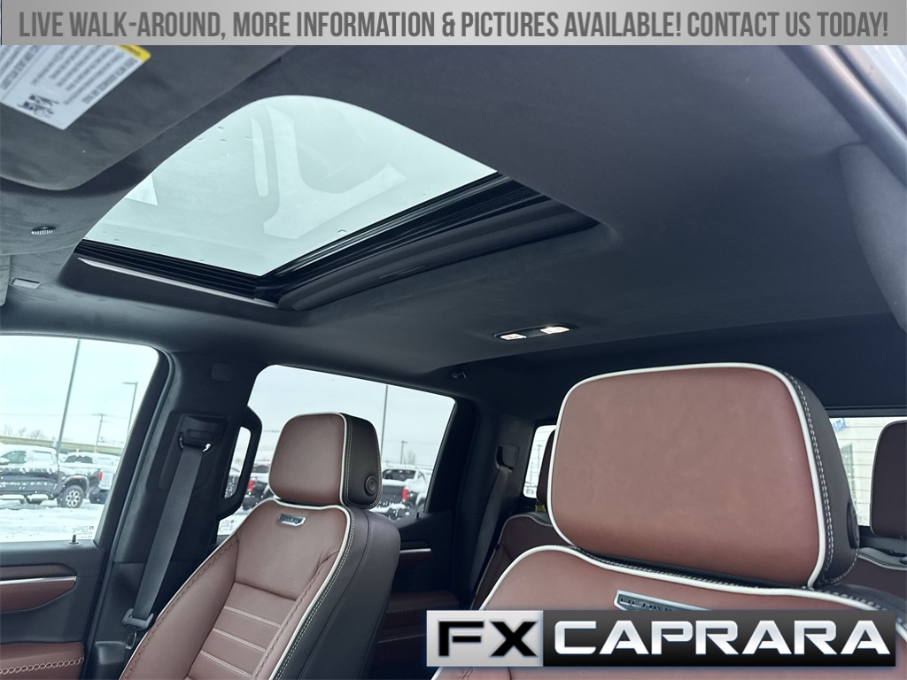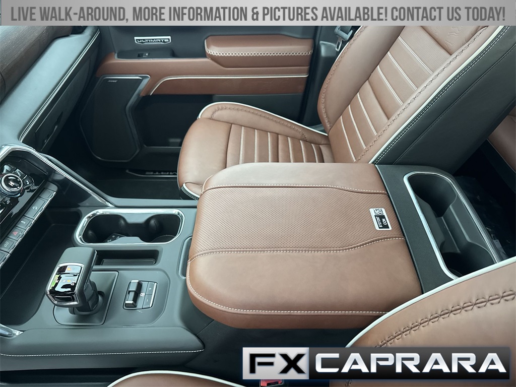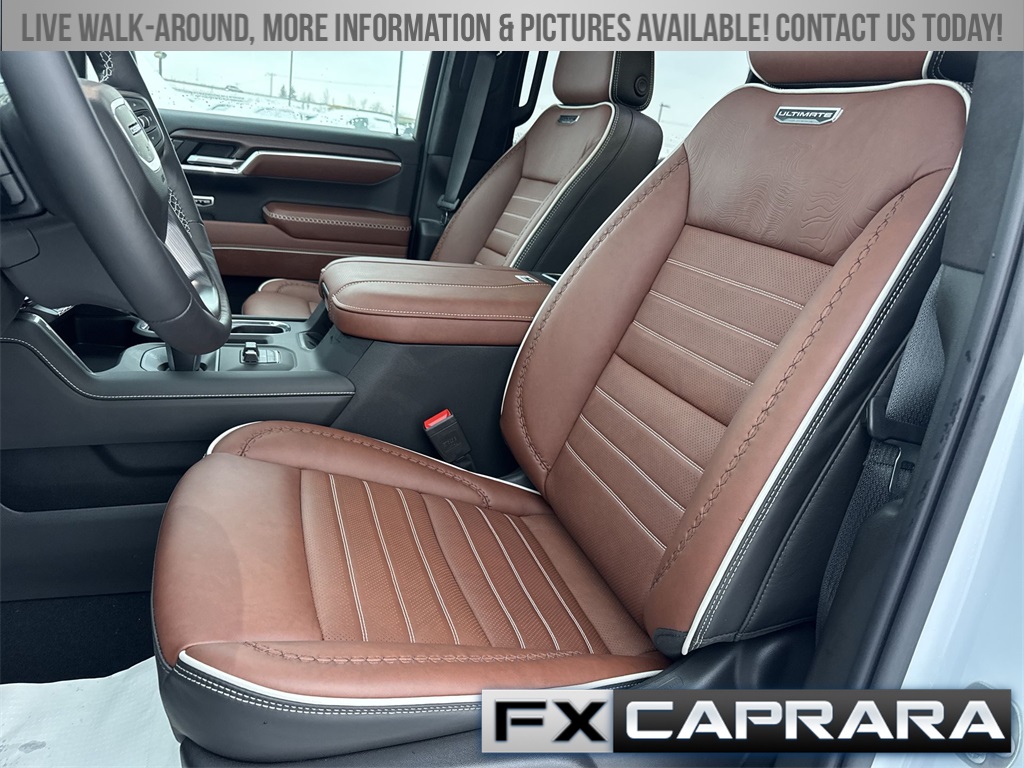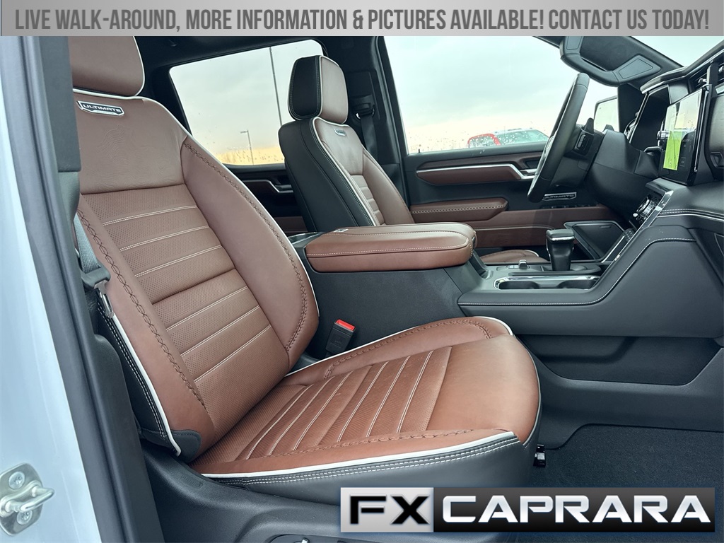 10-Speed Automatic, 4WD, Alpine Umber Leather, 12 Speakers, 120-Volt Bed Mounted Power Outlet, 120-Volt Interior Power Outlet, 16-Way Power Driver Seat Adjuster w/Lumbar, 16-Way Power Passenger Seat Adjuster w/Lumbar, 170 Amp Alternator, 2 Charge/Data USB Ports Inside Center Console, 2 Type-C Charge-Only Rear USB Ports, 2 USB Ports, 3.23 Rear Axle Ratio, 4-Wheel Disc Brakes, ABS brakes, Adaptive suspension, Air Conditioning, Alloy wheels, AM/FM radio: SiriusXM with 360L, Apple CarPlay/Android Auto, Auto High-beam Headlights, Auto-dimming door mirrors, Auto-dimming Rear-View mirror, Auto-Locking Rear Differential, Automatic temperature control, Bed View Camera, Body Color Wheel Arch Moldings (LPO), Bose Premium Series w/12-Speaker System, Brake assist, Buckle to Drive, Bumpers: body-color, Chrome Recovery Hooks, Color-Keyed Carpeting Floor Covering, Compass, Deep-Tinted Glass, Delay-off headlights, Denali Premium Suspension w/Adaptive Ride Control, Driver door bin, Driver Memory, Driver vanity mirror, Dual Active Exhaust, Dual front impact airbags, Dual front side impact airbags, Electric Rear-Window Defogger, Electronic Stability Control, Emergency communication system: OnStar, Enhanced Automatic Emergency Braking, Floor-Mounted Center Console, Following Distance Indicator, Forward Collision Alert, Front anti-roll bar, Front Bucket Seats, Front Center Armrest, Front dual zone A/C, Front fog lights, Front Pedestrian Braking, Front Rain-Sensing Wipers, Front reading lights, Front wheel independent suspension, Full Grain Leather Seat Trim, Fully automatic headlights, Garage door transmitter, Genuine wood console insert, Genuine wood dashboard insert, Genuine wood door panel insert, HD Surround Vision, Heads-Up Display, Heated 2nd Row Outboard Seats, Heated door mirrors, Heated Driver & Front Outboard Passenger Seating, Heated front seats, Heated rear seats, Heated steering wheel, Heavy-Duty Air Filter, High Gloss Black Header w/Signature Denali Grille, Hill Descent Control, Hitch Guidance, Hitch View, Illuminated entry, In-Vehicle Trailering System App, Integrated Trailer Brake Controller, IntelliBeam Automatic High Beam On/Off, Keyless Open & Start, LED Cargo Area Lighting, Low tire pressure warning, Memory seat, Multicolor 15" Diagonal Head-Up Display, MultiPro Tailgate Audio System by Kicker (LPO), Navigation System, Occupant sensing airbag, OnStar Services Capable, Outside temperature display, Overhead airbag, Overhead console, Panic alarm, Passenger door bin, Passenger vanity mirror, Perimeter Lighting, Power Door Locks, Power door mirrors, Power driver seat, Power Front Passenger Windows w/Express Up/Down, Power Front Windows w/Driver Express Up/Down, Power moonroof, Power passenger seat, Power Rake & Telescoping Steering Column, Power Rear Windows w/Express Down, Power Sliding Rear Window w/Rear Defogger, Power steering, Power Sunroof, Power windows, Preferred Equipment Group 5SB, Push Button Start, Radio data system, Radio: Premium GMC Infotainment Audio System, Rain sensing wipers, Rear Cross Traffic Braking, Rear Pedestrian Detection, Rear reading lights, Rear seat center armrest, Rear step bumper, Rear Wheelhouse Liners, Rear window defroster, Remote keyless entry, Remote Vehicle Starter System, Safety Alert Seat, Security system, SiriusXM w/360L Trial Subscription, Speed control, Speed-sensing steering, Split folding rear seat, Spray-On Pickup Bedliner w/GMC Logo, Steering Wheel Audio Controls, Steering wheel mounted audio